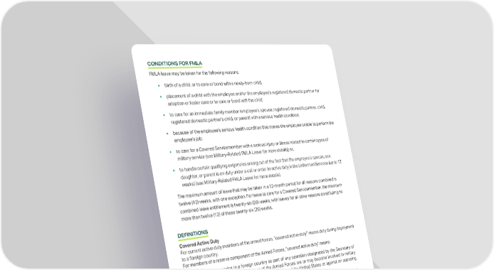 CONDITIONS FOR FMLA FMLA leave may be taken for the following reasons: birth of a child, or to care or bond with a newly-born child; placement of a child with the employee and/or the employee’s registered domestic partner for adoption or foster care or to care or bond with the child; to care for an immediate family member (employee’s spouse, registered domestic partner, child, registered domestic partner’s child, or parent) with a serious health condition; because of the employee’s serious health condition that makes the employee unable to perform the employee’s job; to care for a Covered Servicemember with a serious injury or illness related to certain types of military service (see Military-Related FMLA Leave for more details); or, to handle certain qualifying exigencies arising out of the fact that the employee’s spouse, son, daughter, or parent is on duty under a call or order to active duty in the Uniformed Services (up to 12 weeks) (see Military-Related FMLA Leave for more details). The maximum amount of leave that may be taken in a 12-month period for all reasons combined is twelve (12) weeks, with one exception. For leave to care for a Covered Servicemember, the maximum combined leave entitlement is twenty-six (26) weeks, with leaves for all other reasons constituting no more than twelve (12) of those twenty-six (26) weeks. DEFINITIONS Covered Active Duty For current active duty members of the armed forces, “covered active duty” means duty during deployment to a foreign country. For members of a reserve component of the Armed Forces, “covered active duty” means: duty during service in a foreign country as part of any operation designated by the Secretary of Defense as one in which members of the Armed Forces are or may become involved in military actions, operations, or hostilities against an enemy of the United States or against an opposing military force; an operation that results in a call to duty of certain members of the Armed Forces from retirement, the reserves, the National Guard, or state militias; or any other operation which is the result of a national emergency declared by the President or Congress. Covered Servicemember Means: 1. a current member of the Armed Forces (including National Guard or Reserves) who has suffered a Serious Injury or Illness incurred in the line of duty for which he or she is undergoing medical treatment, recuperation, or therapy; is otherwise in outpatient status; or is on the Temporary Disability Retired List; or BACK TO TABLE OF CONTENTS | 22