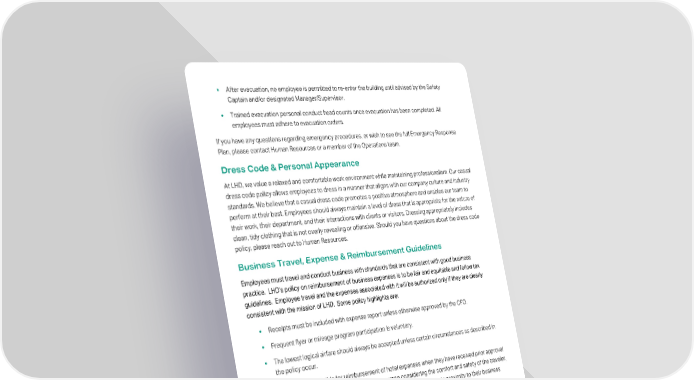 After evacuation, no employee is permitted to re-enter the building until advised by the Safety Captain and/or designated Manager/Supervisor. Trained evacuation personal conduct head counts once evacuation has been completed. All employees must adhere to evacuation orders. If you have any questions regarding emergency procedures, or wish to see the full Emergency Response Plan, please contact Human Resources or a member of the Operations team. Dress Code & Personal Appearance At LHD, we value a relaxed and comfortable work environment while maintaining professionalism. Our casual dress code policy allows employees to dress in a manner that aligns with our company culture and industry standards. We believe that a casual dress code promotes a positive atmosphere and enables our team to perform at their best. Employees should always maintain a level of dress that is appropriate for the nature of their work, their department, and their interactions with clients or visitors. Dressing appropriately includes clean, tidy clothing that is not overly revealing or offensive. Should you have questions about the dress code policy, please reach out to Human Resources. Business Travel, Expense & Reimbursement Guidelines Employees must travel and conduct business with standards that are consistent with good business practice. LHD’s policy on reimbursement of business expenses is to be fair and equitable and follow tax guidelines. Employee travel and the expenses associated with it will be authorized only if they are clearly consistent with the mission of LHD. Some policy highlights are: Receipts must be included with expense report unless otherwise approved by the CFO. Frequent flyer or mileage program participation is voluntary. The lowest logical airfare should always be accepted unless certain circumstances as described in the policy occur. Employees are eligible for reimbursement of hotel expenses when they have received prior approval for overnight business travel. While we encourage considering the comfort and safety of the traveler, employees are expected to select reasonably priced hotels that are in proximity to their business destination. All employees are expected to follow applicable local, state, and federal laws and regulations regarding the use of cellphones while driving. Employees who are charged with traffic violations resulting from the use of their phone while driving will be solely responsible for all liabilities that result from such actions. Employees, when not entertaining clients, will use the following Guidelines (including tax, tip and alcohol): o Breakfast up to $15; o Lunch up to $20: BACK TO TABLE OF CONTENTS | 11