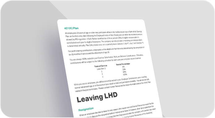 401(K) Plan All employees 20 years of age or older may participate either in the traditional pre-tax or Roth 401(k) Savings Plan on the first entry date following the Employee’s date of hire. Employees can defer the maximum amount allowed by IRS regulation. A Safe Harbor contribution of three percent (3%) of eligible compensation is contributed each year to eligible Employees. The company can also provide a matching contribution which is determined annually. Plan Entry dates occur on a quarterly basis (January 1, April 1, July 1 and October 1). For profit sharing contributions, employees will be eligible on the first entry date following the completion of six (6) months of service and the attainment of age 20. You are always 100% vested in your Elective, Safe Harbor, Roth, and Rollover Contributions. Otherwise, contributions will be subject to the following schedule for each year you complete required service: Years of Service Vested Percentage Less than 2 0% 2 33% 3 66% 4 100% While you are an employee, you will become fully vested in your Employer Contributions upon reaching normal retirement age, or in the event of your death or total and permanent disability. You will also be fully vested if the plan terminates. Please contact Human Resources for more information about the 401(k) Plan. Leaving LHD Resignation When an employee decides to leave for any reason, their supervisor and Human Resources would like the opportunity to discuss the resignation before final action is taken. If, however, after full consideration the employee decides to leave, it is requested that the Employee provide the company with a written two-week advance notice period. A brief exit interview will be conducted by Human Resources of the departing Employee prior to the individual leaving. COBRA In the event of your termination, resignation, or loss of eligibility to remain covered under our group health insurance program, you and your eligible dependents may have the right to continued coverage under our health insurance program for a limited period of time at your own expense under the Cobra Provision Act. You will receive COBRA information 14 days following the last day of coverage under our group health insurance program. BACK TO TABLE OF CONTENTS | 32