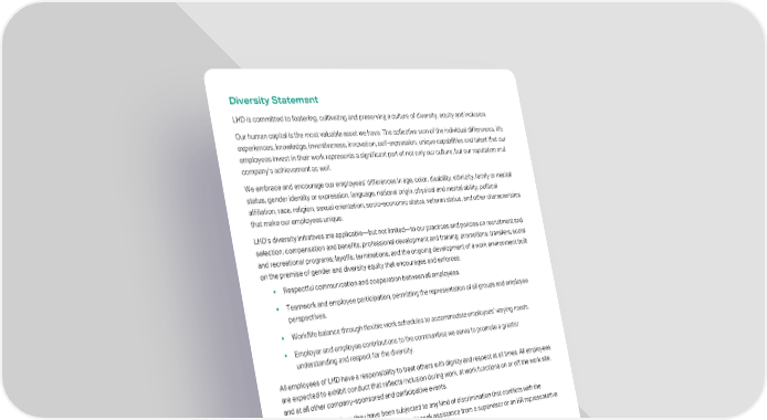 Diversity Statement LHD is committed to fostering, cultivating and preserving a culture of diversity, equity and inclusion. Our human capital is the most valuable asset we have. The collective sum of the individual differences, life experiences, knowledge, inventiveness, innovation, self-expression, unique capabilities and talent that our employees invest in their work represents a significant part of not only our culture, but our reputation and company’s achievement as well. We embrace and encourage our employees’ differences in age, color, disability, ethnicity, family or marital status, gender identity or expression, language, national origin, physical and mental ability, political affiliation, race, religion, sexual orientation, socio-economic status, veteran status, and other characteristics that make our employees unique. LHD’s diversity initiatives are applicable—but not limited—to our practices and policies on recruitment and selection; compensation and benefits; professional development and training; promotions; transfers; social and recreational programs; layoffs; terminations; and the ongoing development of a work environment built on the premise of gender and diversity equity that encourages and enforces: Respectful communication and cooperation between all employees. Teamwork and employee participation, permitting the representation of all groups and employee perspectives. Work/life balance through flexible work schedules to accommodate employees’ varying needs. Employer and employee contributions to the communities we serve to promote a greater understanding and respect for the diversity. All employees of LHD have a responsibility to treat others with dignity and respect at all times. All employees are expected to exhibit conduct that reflects inclusion during work, at work functions on or off the work site, and at all other company-sponsored and participative events. Employees who believe they have been subjected to any kind of discrimination that conflicts with the company’s diversity policy and initiatives should seek assistance from a supervisor or an HR representative. Equal Employment Opportunity Equal Employment Opportunity has been, and will continue to be, a fundamental principle at LHD, where employment is based upon personal capabilities and qualifications without discrimination because of race, color, creed, religion, sex, sexual orientation, age, national origin, disability, veteran status or any other protected characteristic as established by law. This policy of Equal Employment Opportunity applies to all policies, procedures, and practices relating to recruitment, hiring, compensation, benefits, termination, and all other conditions of employment. Americans with Disabilities Act (ADA) and Reasonable Accommodation BACK TO TABLE OF CONTENTS | 4