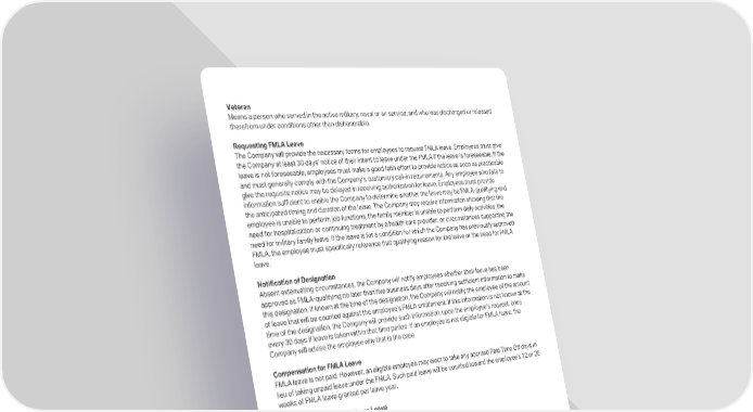 Veteran Means a person who served in the active military, naval or air service, and who was discharged or released therefrom under conditions other than dishonorable. Requesting FMLA Leave The Company will provide the necessary forms for employees to request FMLA leave. Employees must give the Company at least 30 days’ notice of their intent to leave under the FMLA if the leave is foreseeable. If the leave is not foreseeable, employees must make a good faith effort to provide notice as soon as practicable and must generally comply with the Company’s customary call-in requirements. Any employee who fails to give the requisite notice may be delayed in receiving authorization for leave. Employees must provide information sufficient to enable the Company to determine whether the leave may be FMLA-qualifying and the anticipated timing and duration of the leave. The Company may require information showing that the employee is unable to perform job functions, the family member is unable to perform daily activities, the need for hospitalization or continuing treatment by a health care provider, or circumstances supporting the need for military family leave. If the leave is for a condition for which the Company has previously approved FMLA, the employee must specifically reference that qualifying reason for the leave or the need for FMLA leave. Notification of Designation Absent extenuating circumstances, the Company will notify employees whether their leave has been approved as FMLA-qualifying no later than five business days after receiving sufficient information to make this designation. If known at the time of the designation, the Company will notify the employee of the amount of leave that will be counted against the employee’s FMLA entitlement. If this information is not known at the time of the designation, the Company will provide such information, upon the employee’s request, once every 30 days if leave is taken within that time period. If an employee is not eligible for FMLA leave, the Company will advise the employee why that is the case. Compensation for FMLA Leave FMLA leave is not paid. However, an eligible employee may elect to take any accrued Paid Time Off days in lieu of taking unpaid leave under the FMLA. Such paid leave will be counted toward the employee’s 12 or 26 weeks of FMLA leave granted per leave year. Intermittent or Reduced Hours Leave In the case of leave taken: 1. to care for a seriously ill spouse, child, or parent; 2. due to the employee’s own Serious Health Condition; 3. due to a Qualifying Exigency; or 4. to care for a Covered Servicemember, …an employee may take leave intermittently (i.e., periodically) or on a reduced hours schedule (i.e., reduced number of working hours per day or per week) only when such leave is medically necessary and certified as such. Otherwise, such leave is not permitted except at the sole discretion of the Company. An employee who takes leave intermittently or on a reduced leave schedule may be temporarily transferred to another position for which the employee is qualified to better accommodate that leave. Job and Benefits Security An eligible employee who takes leave under the FMLA and who returns to work before his or her annual FMLA entitlement has expired will be restored to the position he or she held when the leave commenced, or to an otherwise equivalent position with respect to pay, benefits, and other terms and conditions of BACK TO TABLE OF CONTENTS | 25
