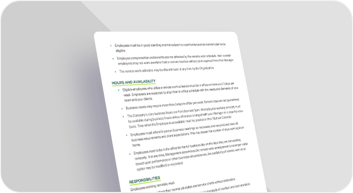 Employees must be in good standing and not subject to a performance improvement plan to be eligible. Employee compensation and benefits are not affected by the remote work schedule. Non-exempt employees may not work overtime from a remote location without prior approval from their Manager. The remote work schedule may be discontinued at any time by the Organization. HOURS AND AVAILABILITY Eligible employees who utilize a remote work schedule must be in office a minimum of 3 days per week. Employees are expected to align their in-office schedule with the needs and demands of your team and your clients. Business needs may require more than 3 days in office per week. Remote days are not guaranteed. The Company’s core business hours are from 8am and 5pm. All employees working remotely must be available during business hours unless otherwise arranged with your Manager on a case-by-case basis. Time when the Employee is unavailable must be posted on their Outlook Calendar. Employees must attend in person business meetings as necessary and required and meet all business requirements and client expectations. This may lessen the number of days working from home. Employees need to be in the office for the full business day on the days they are not working remotely. If at any time, Management determines the remote work arrangement is no longer viable based upon performance or other business circumstances, the availability of remote work as an option may be modified or rescinded. RESPONSIBILITIES Employees working remotely must: Be able to perform their normal job duties and service clients without distraction. Adhere to all LHD policies, procedures, professional standards of conduct and best practices. Maintain a designated and safe remote work area. Maintain a secure home network with minimum security settings of WPA2 (AES-256). Alert the Security Officer of any changes in either your physical environment or home network. Log into LHD systems and all related programs at their normal start time. Keep Outlook calendars up to date with meetings, planned PTO, scheduled Work From Home dates, and any other out of office appointments. Maintain the security, integrity, and confidentiality of all client data and follow proper procedures for shredding any printed documents with confidential information produced at a remote site. BACK TO TABLE OF CONTENTS | 14