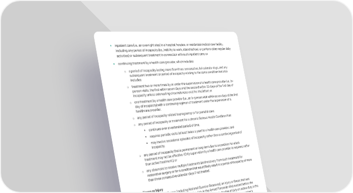 inpatient care (i.e., an overnight stay) in a hospital, hospice, or residential medical care facility, including any period of incapacity (i.e., inability to work, attend school, or perform other regular daily activities) or subsequent treatment in connection with such inpatient care; or continuing treatment by a health care provider, which includes: o a period of incapacity lasting more than three consecutive, full calendar days, and any subsequent treatment or period of incapacity relating to the same condition that also includes: o treatment two or more times by or under the supervision of a health care provider (i.e., in- person visits, the first within seven days and the second within 30 days of the first day of incapacity unless extenuating circumstances exist for the latter); or o one treatment by a health care provider (i.e., an in-person visit within seven days of the first day of incapacity) with a continuing regimen of treatment under the supervision of a healthcare provider. o any period of incapacity related to pregnancy or for prenatal care; o any period of incapacity or treatment for a chronic Serious Health Condition that: continues over an extended period of time; requires periodic visits (at least twice a year) to a health care provider; and may involve occasional episodes of incapacity rather than a continuing period of incapacity. o any period of incapacity that is permanent or long-term due to a condition for which treatment may not be effective. (Only supervision by a health care provider is required, rather than active treatment.); or o any absences to receive multiple treatments (and recovery from such treatment) for restorative surgery or for a condition that would likely result in a period of incapacity of more than three consecutive calendar days if not treated. Serious Illness or Injury For members of the Armed Forces (including National Guard or Reserves), an injury or illness that was incurred by the member in the line of duty on active duty in the Armed Forces (or that existed before the beginning of the member’s active duty and was aggravated by service in the line of duty on active duty in the Armed Forces) and that may render the member medically unfit to perform the duties of the member’s office, grade, rank, or rating. For veterans of the Armed Forces (including National Guard or Reserves) who were members of the Armed Forces (including National Guard or Reserves) at any time in the five years immediately preceding the treatment or therapy, an injury or illness that was incurred by the member in the line of duty on active duty in the Armed Forces (or existed before the beginning of the member’s active duty and was aggravated by service in the line of duty on active duty in the Armed Forces). Single 12-month Period The Single 12-Month Period pertaining to leave to care for a Covered Servicemember begins the first day the employee takes FMLA leave to care for the Covered Servicemember and ends 12 months after that, regardless of the Leave Year used by the Company for other types of FMLA leave. BACK TO TABLE OF CONTENTS | 24