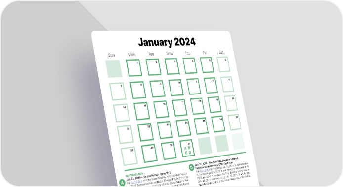 January 2024 Sun Mon Tue Wed Thu Fri Sat 1 2 3 4 5 6 7 8 9 10 11 12 13 14 15 16 17 18 19 20 21 22 23 24 25 26 27 28 29 30 31 A B C D KEY DEADLINES D Jan. 31, 2024—File Form 940, Employer’s Annual A Jan. 31, 2024—File and Furnish Forms W-2 Federal Unemployment (FUTA) Tax Return File Forms W-2 with the Social Security Administration by Jan. File Form 940 with the IRS by Jan. 31, 2024, to report taxable 31, 2024. Companies may request a 30-day filing extension by FUTA wages paid in 2023. If your company deposited all its using Form 8809, but extensions will only be granted in limited FUTA tax when it was due, the filing deadline is extended to cases for extraordinary circumstances or catastrophes. Forms Feb. 10, 2024. However, since Feb. 10, 2024, is a Saturday, W-2 must also be furnished to employees on or before Jan. the extended deadline is the next business day, which is Feb. 31, 2024. 12, 2024. B Jan. 31, 2024—File and Furnish Forms 1099-NEC, COMPLIANCE REMINDERS Nonemployee Compensation As 2024 begins, review your company’s compliance with File Forms 1099-NEC with the IRS by Jan. 31, 2024, if your federal, state and local employment laws, including any new company made payments totaling $600 or more for services requirements. This review should include: performed by nonemployees, such as independent contrac- • Checking that workplace posters are up to date. tors, in 2023. A 30-day filing extension may be requested • Verifying minimum wage and overtime requirements by using Form 8809, but extensions will only be granted in and updating the wage base limit for withholding. limited cases for extraordinary circumstances or catastro- • Reviewing procedures for completing Form I-9 phes. Companies must also furnish statements to the nonem- (Employment Eligibility Verification). ployees on or before Jan. 31, 2024. • Confirming employee leave policies are consistent with Jan. 31, 2024—File Form 941, Employer’s federal, state and local leave requirements. C Quarterly Federal Tax Return • Reviewing any new fair employment law protections and File Form 941 with the IRS by Jan. 31, 2024, to report the incorporating changes into employee training. federal income tax, social security tax and Medicare tax you • Updating the employee handbook and employment withheld from your employees’ pay during the fourth quarter policies as necessary. of 2023 (October, November and December). If your company • Making a schedule for any required workplace training, timely deposited all taxes when they were due, the filing such as sexual harassment training. deadline is extended to Feb. 10, 2024. However, since Feb. 10, • Reviewing recruitment and compensation practices 2024, is a Saturday, the extended deadline is the next busi- to ensure they are consistent with any applicable pay ness day, which is Feb. 12, 2024. transparency laws. 3