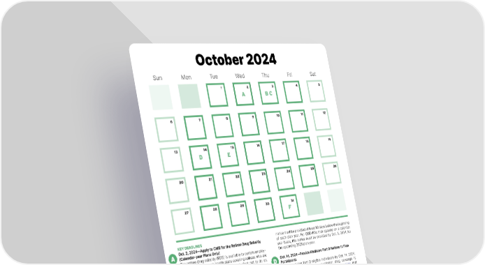 October 2024 Sun Mon Tue Wed Thu Fri Sat 1 2 3 4 5 A BC 6 7 8 9 10 11 12 13 14 15 16 17 18 19 D E 20 21 22 23 24 25 26 27 28 29 30 31 F KEY DEADLINES notice must be provided at least 90 days before the beginning A Oct. 2, 2024—Apply to CMS for the Retiree Drug Subsidy of each plan year. For QSEHRAs that operate on a calendar (Calendar-year Plans Only) year basis, this notice must be provided by Oct. 3, 2024, for The retiree drug subsidy (RDS) is available to certain employ- the upcoming 2025 plan year. ers who sponsor group health plans covering retirees who are entitled to enroll in Medicare Part D but elect not to do so. D Oct. 14, 2024—Provide Medicare Part D Notices to Plan To participate in the RDS program, eligible employers must Participants submit an application to CMS before the beginning of the Notify Medicare Part D eligible individuals by Oct. 14, 2024, plan year by a date specified by CMS (usually about 90 days whether the health plan’s prescription drug coverage is before the beginning of the plan year). The approximate dead- creditable or non-creditable. CMS has model notices that line is Oct. 2, 2024, for plan years beginning on Jan. 1, 2025. employers may use. This deadline may be extended by 30 days if CMS grants an extension. E Oct. 15, 2024—File Form 5500 for the 2023 Plan Year (Calendar-year Plans Only)—Form 5500 Deadline Was B Oct. 3, 2024—Provide ICHRA Notice for 2025 Plan Year Extended (Calendar-year Plans Only) File Form 5500 with the DOL by Oct. 15, 2024, if you have a Employers who offer individual coverage health reimburse- calendar-year plan and applied for the automatic 2.5-month ment arrangements (ICHRAs) must provide a notice to eligible filing extension. employees regarding the ICHRA’s coverage. This notice must be provided at least 90 days before the beginning of each F Oct. 31, 2024—File Form 941, Employer’s Quarterly Federal plan year. For ICHRAs that operate on a calendar year basis, Tax Return this notice must be provided by Oct. 3, 2024, for the upcom- File Form 941 with the IRS by Oct. 31, 2024, to report the ing 2025 plan year. A model notice is available for employers federal income tax, Social Security tax and Medicare tax you to use. withheld from your employees’ pay during the third quarter of 2023 (July, August and September). Employers who timely C Oct. 3, 2024—Provide QSEHRA Notice for the 2025 Plan deposited all taxes when due have 10 additional calendar Year (Calendar-year Plans Only) days to file Form 941 or until Nov. 10, 2024. However, since Employers who offer qualified small employer health reim- Nov. 10, 2024, is a Sunday, the extended deadline is the next bursement arrangements (QSEHRAs) must provide a notice business day, which is Nov. 11, 2024. to eligible employees regarding the QSEHRA’s coverage. This 13