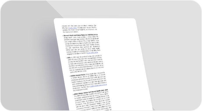 included with the plan’s open enrollment materials. The DOL has a model notice that employers may use. The DOL updates this model notice frequently, so ensure you use the most current version. • Women’s Health and Cancer Rights Act (WHCRA) Notice: Group health plans must provide a notice about the WHCRA’s coverage requirements at the time of enrollment and annually after enrollment. The annual WHCRA notice can be provided at any time during the year, but it is often included with the plan’s open enrollment materials. Employ- ers who redistribute their summary plan descriptions (SPDs) each year can satisfy the annual notice require- ment by including the WHCRA notice in their SPDs. Model language is available in the DOL’s model notice guide. • SPD: An SPD must be provided to new plan participants within 90 days of the date their coverage begins. Employ- ers may include the SPD in their open enrollment materials to make sure employees newly enrolled employees receive the SPD on a timely basis. Also, an employer should include the SPD with its enrollment materials if it includes notices that are required to be provided at the time of enrollment, such as the WHCRA notice. • COBRA General Notice: Group health plans must provide a written General Notice of COBRA Rights to covered employees within 90 days after their health plan coverage begins. Employers may include the General Notice in their open enrollment materials to ensure that employees who newly enroll during open enrollment receive the notice on a timely basis. The DOL has a COBRA Model General Notice that employers may use. • HIPAA Privacy Notice (self-insured health plans only): The HIPAA Privacy Rule requires self-insured health plans to maintain and provide their own privacy notices. Self-in- sured health plans are required to send the privacy notice at certain times, including to new enrollees at the time of enrollment. Thus, the privacy notice should be included with the plan’s open enrollment materials. Also, at least once every three years, health plans must either redistrib- ute the privacy notice or notify participants that the privacy notice is available and explain how to obtain a copy. The Department of Health and Human Services (HHS) has model privacy notices for employers to use. • Special Enrollment Rights Notice: At or before enrollment, a group health plan must provide each eligible employee with a notice of their special enrollment rights under HIPAA. This notice is often included in the plan’s SPD or benefits booklet provided by the issuer or TPA. • Notice of Patient Protections: If a health plan requires participants to designate a participating primary care provider, the plan or issuer must provide a notice of patient protections whenever the SPD or similar description of benefits is provided to a participant. This notice is often included in the SPD or benefits booklet provided by the issuer or TPA (or otherwise provided with enrollment mate- rials). The DOL has provided a model notice for employers to use. • Grandfathered Plan Notice: Companies with grandfa- thered health plans must include a statement of the plan’s grandfathered status in plan materials provided to partic- ipants describing the plan’s benefits (such as open enroll- ment materials). The DOL has a model notice for employers to use. 12