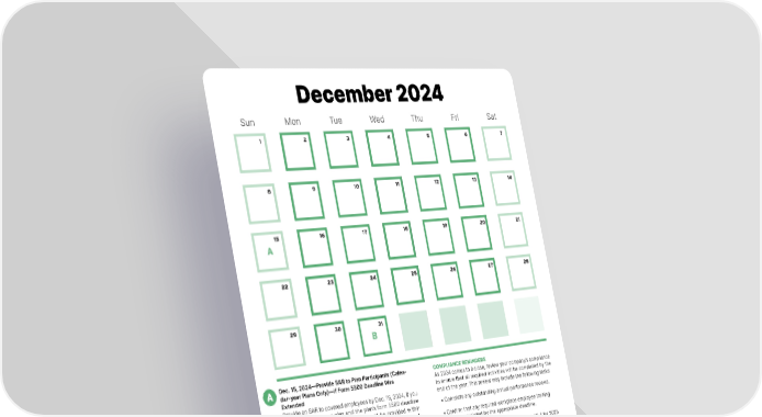 December 2024 Sun Mon Tue Wed Thu Fri Sat 1 2 3 4 5 6 7 8 9 10 11 12 13 14 15 16 17 18 19 20 21 A 22 23 24 25 26 27 28 29 30 31 B A Dec. 15, 2024—Provide SAR to Plan Participants (Calen- COMPLIANCE REMINDERS dar-year Plans Only)—If Form 5500 Deadline Was As 2024 comes to a close, review your company’s compliance Extended to ensure that all required activities will be completed by the Provide an SAR to covered employees by Dec. 15, 2024, if you end of the year. This review may include the following tasks: have a calendar-year plan and the plan’s form 5500 deadline • Complete any outstanding annual performance reviews. was extended. In general, the SAR must be provided within nine months of the close of the plan year. However, if the plan’s • Confirm that any required workplace employee training Form 5500 deadline was extended, the SAR must be provided will be completed by the appropriate deadline. within two months after the close of the extension period. For calendar-year plans, this extended deadline is Dec. 15, 2024. • Encourage employees to fill out a new Form W-4 for 2025 Plans that are exempt from the annual 5500 filing requirement if they have experienced personal or financial changes are not required to provide a SAR. Unfunded welfare plans are that impact their tax withholding. also generally exempt from the SAR requirement. • Confirm that annual nondiscrimination testing has been Dec. 31, 2024—Submit a Gag Clause Attestation for Your performed for employee benefit plans that are subject to B Health Plan these testing requirements, including Section 125 cafete- A federal transparency law requires health plans and health ria plans, self-insured health plans, health FSAs, depen- insurance issuers to submit attestations of compliance with dent care FSAs, HRAs, group term life insurance and the prohibition on gag clauses by Dec. 31 each year. Plans retirement plans. and issuers submit their attestations through a CMS website. If the issuer for a fully insured health plan provides the attes- tation, the health plan does not also need to provide an attes- tation. Employers with self-insured health plans can enter into written agreements with their TPAs to provide the attestation, but the legal responsibility remains with the health plan. 15
