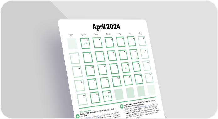April 2024 Sun Mon Tue Wed Thu Fri Sat 1 2 3 4 5 6 A B 7 8 9 10 11 12 13 14 15 16 17 18 19 20 B 21 22 23 24 25 26 27 28 29 30 C D KEY DEADLINES C April 30, 2024—Remove OSHA Form 300A (Summary of A April 1, 2024—Electronically File ACA Forms 1094-C Work-related Injuries and Illnesses) and 1095-C Remove your company’s OSHA Form 300A posting at any File Forms 1094-C and 1095-C with the IRS by April 1, 2024, if time on or after April 30, 2024. This form, which summarizes your company is an ALE. The normal filing deadline is March workplace data from 2023, must be posted from Feb. 1, 2024, 31. However, since March 31, 2024, is a Sunday, electronic until April 30, 2024. This posting requirement does not apply returns must be filed by the next business day, which is April 1, to companies with 10 or fewer employees or employers in a 2024. Employers may request an automatic 30-day extension partially exempt industry. by filing Form 8809 by the filing due date. Beginning in 2024, most employers subject to ACA reporting are required to file D April 30, 2024—File Form 941, Employer’s Quarterly their returns electronically. Paper filing is only an option for Federal Tax Return very small employers (i.e., employers who file fewer than 10 File Form 941 with the IRS by April 30, 2024, to report the information returns during the year). The paper filing deadline federal income tax, social security tax and Medicare tax you is Feb. 28, 2024. withheld from your employees’ pay during the first quarter of 2024 (January, February and March). If your company timely B April 1, 2024—Electronically File ACA Forms 1094-B deposited all taxes when they were due, the filing deadline is and 1095-B extended to May 10, 2024. File Forms 1094-B and 1095-B with the IRS by April 1, 2014, if your company is a non-ALE that sponsors a self-insured health plan. The normal filing deadline is March 31. However, since March 31, 2024, is a Sunday, electronic returns must be filed by the next business day, which is April 1, 2014. Employ- ers may request an automatic 30-day extension by filing Form 8809 by the filing due date. Beginning in 2024, most employers subject to ACA reporting are required to file their returns electronically. Paper filing is an option only for very small employers (i.e., employers who file fewer than 10 infor- mation returns during the year). The paper filing deadline is Feb. 28, 2024. 6