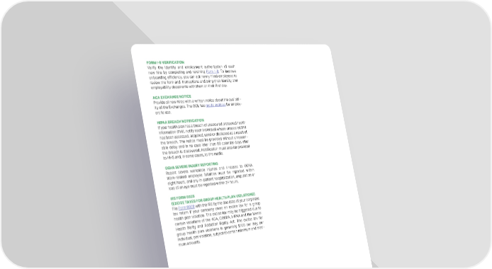 FORM I-9 VERIFICATION Verify the identity and employment authorization of each new hire by completing and retaining Form I-9. To improve onboarding efficiency, you can ask newly hired employees to review the form and Instructions and bring their identity and employability documents with them on their first day. ACA EXCHANGE NOTICE Provide all new hires with a written notice about the availabil- ity of the Exchanges. The DOL has model notices for employ- ers to use. HIPAA BREACH NOTIFICATION If your health plan has a breach of unsecured protected health information (PHI), notify each individual whose unsecured PHI has been accessed, acquired, used or disclosed as a result of the breach. The notice must be provided without unreason- able delay and in no case later than 60 calendar days after the breach is discovered. Notification must also be provided to HHS and, in some cases, to the media. OSHA SEVERE INJURY REPORTING Report severe workplace injuries and illnesses to OSHA. Work-related employee fatalities must be reported within eight hours, and any in-patient hospitalization, amputation or loss of an eye must be reported within 24 hours. IRS FORM 8928 (EXCISE TAXES FOR GROUP HEALTH PLAN VIOLATIONS) File Form 8928 with the IRS by the due date of your corporate tax return if your company owes an excise tax for a group health plan violation. The excise tax may be triggered due to certain violations of the ACA, COBRA, HIPAA and the Mental Health Parity and Addiction Equity Act. The excise tax for group health plan violations is generally $100 per day, per individual, per violation, subject to certain minimum and maxi- mum amounts. 18