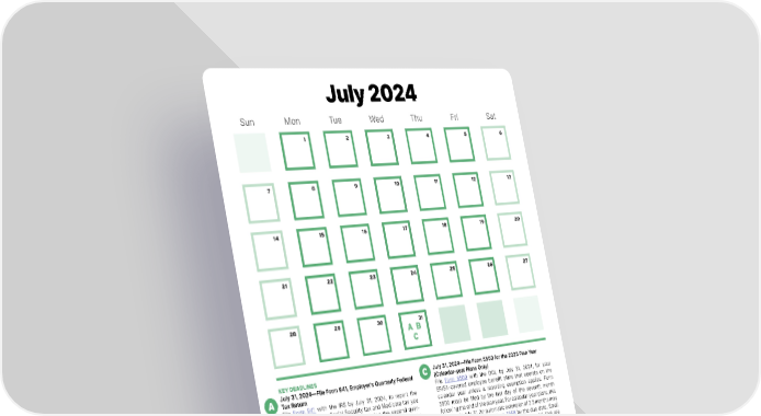 July 2024 Sun Mon Tue Wed Thu Fri Sat 1 2 3 4 5 6 7 8 9 10 11 12 13 14 15 16 17 18 19 20 21 22 23 24 25 26 27 28 29 30 31 A B C KEY DEADLINES C July 31, 2024—File Form 5500 for the 2023 Plan Year A July 31, 2024—File Form 941, Employer’s Quarterly Federal (Calendar-year Plans Only) Tax Return File Form 5500 with the DOL by July 31, 2024, for your File Form 941 with the IRS by July 31, 2024, to report the ERISA-covered employee benefit plans that operate on the federal income tax, Social Security tax and Medicare tax you calendar year unless a reporting exemption applies. Form withheld from your employees’ pay during the second quar- 5500 must be filed by the last day of the seventh month ter of 2024 (April, May and June). If your company timely following the end of the plan year. For calendar-year plans, this deposited all taxes when they were due, the filing deadline is deadline is July 31. An automatic extension of 2.5 months may extended to Aug. 10, 2024. However, since Aug. 10, 2024, is be requested by filing IRS Form 5558 by the due date. Small a Saturday, the extended deadline is the next business day, welfare benefit plans (fewer than 100 participants) that are which is Aug. 12, 2024. fully insured, unfunded, or a combination of insured/unfunded are generally exempt from the Form 5500 filing requirement. July 31, 2024—Report and Pay PCORI Fees (Self-insured B Health Plans Only) If you have a self-insured health plan, report and pay fees to fund the Patient-Centered Outcomes Research Institute (PCORI) by July 31, 2024. Employers use IRS Form 720 to report and pay PCORI fees. PCORI fees for plan years ending in 2023 are due by July 31, 2024. 9