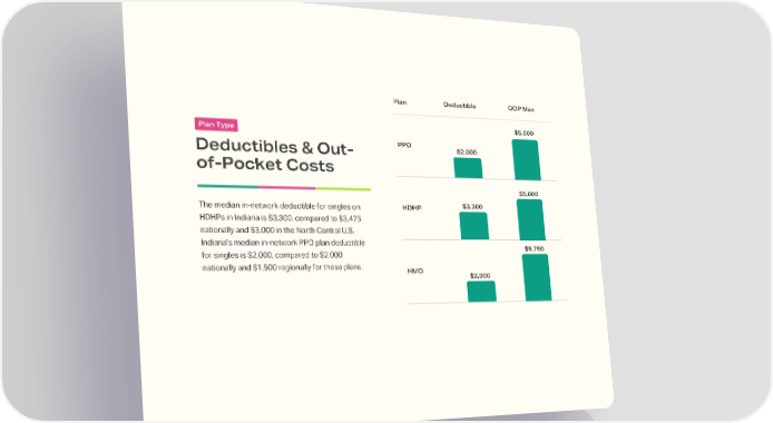 Plan Deductible OOP Max $5,000 Plan Type PPO $2,000 Deductibles & Out- of-Pocket Costs $5,000 $3,300 HDHP The median in-network deductible for singles on HDHPs in Indiana is $3,300, compared to $3,475 nationally and $3,000 in the North Central U.S. Indiana’s median in-network PPO plan deductible $5,750 for singles is $2,000, compared to $2,000 nationally and $1,500 regionally for these plans. HMO $2,000