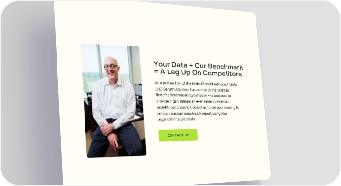Your Data + Our Benchmark = A Leg Up On Competitors As a partner firm of the United Benefit Advisors® (UBA), LHD Benefit Advisors has access to the Milliman Benefits benchmarking database -- a tool used to provide organizations an even more customized benefits benchmark. Contact us to set up a meeting to create a custom benchmark report using your organization's plan data. CONTACT US