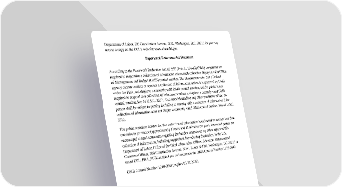 Department of Labor, 200 Constitution Avenue, N.W., Washington, D.C. 20210. Or you may access a copy on the DOL's web site www.efast.dol.gov. Paperwork Reduction Act Statement According to the Paperwork Reduction Act of 1995 (Pub. L. 104-13) (PRA), no persons are required to respond to a collection of information unless such collection displays a valid Office of Management and Budget (OMB) control number. The Department notes that a Federal agency cannot conduct or sponsor a collection of information unless it is approved by OMB under the PRA, and displays a currently valid OMB control number, and the public is not required to respond to a collection of information unless it displays a currently valid OMB control number. See 44 U.S.C. 3507. Also, notwithstanding any other provisions of law, no person shall be subject to penalty for failing to comply with a collection of information if the collection of information does not display a currently valid OMB control number. See 44 U.S.C. 3512. The public reporting burden for this collection of information is estimated to average less than one minute per notice (approximately 3 hours and 11 minutes per plan). Interested parties are encouraged to send comments regarding the burden estimate or any other aspect of this collection of information, including suggestions for reducing this burden, to the U.S. Department of Labor, Office of the Chief Information Officer, Attention: Departmental Clearance Officer, 200 Constitution Avenue, N.W., Room N-1301, Washington, DC 20210 or email [email protected] and reference the OMB Control Number 1210-0040. OMB Control Number 1210-0040 (expires 03/31/2026)