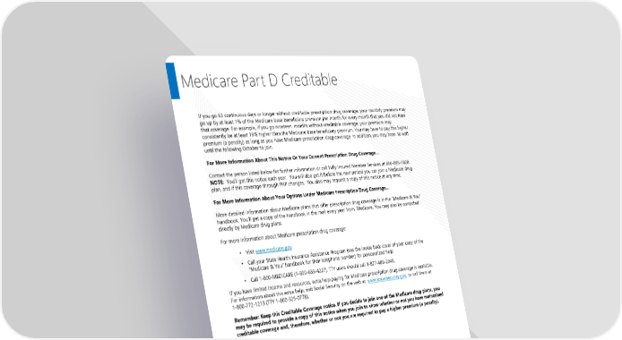 Page 25 | Jay School Corporation 2025 Compliance Bundle Medicare Part D Creditable If you go 63 continuous days or longer without creditable prescription drug coverage, your monthly premium may go up by at least 1% of the Medicare base beneficiary premium per month for every month that you did not have that coverage. For example, if you go nineteen months without creditable coverage, your premium may consistently be at least 19% higher than the Medicare base beneficiary premium. You may have to pay this higher premium (a penalty) as long as you have Medicare prescription drug coverage. In addition, you may have to wait until the following October to join. For More Information About This Notice Or Your Current Prescription Drug Coverage… Contact the person listed below for further information or call Fully Insured Member Services at 866-895-5828. NOTE: You’ll get this notice each year. You will also get it before the next period you can join a Medicare drug plan, and if this coverage through PHP changes. You also may request a copy of this notice at any time. For More Information About Your Options Under Medicare Prescription Drug Coverage… More detailed information about Medicare plans that offer prescription drug coverage is in the “Medicare & You” handbook. You’ll get a copy of the handbook in the mail every year from Medicare. You may also be contacted directly by Medicare drug plans. For more information about Medicare prescription drug coverage: • Visit www.medicare.gov • Call your State Health Insurance Assistance Program (see the inside back cover of your copy of the “Medicare & You” handbook for their telephone number) for personalized help • Call 1-800-MEDICARE (1-800-633-4227). TTY users should call 1-877-486-2048. If you have limited income and resources, extra help paying for Medicare prescription drug coverage is available. For information about this extra help, visit Social Security on the web at www.socialsecurity.gov, or call them at 1-800-772-1213 (TTY 1-800-325-0778). Remember: Keep this Creditable Coverage notice. If you decide to join one of the Medicare drug plans, you may be required to provide a copy of this notice when you join to show whether or not you have maintained creditable coverage and, therefore, whether or not you are required to pay a higher premium (a penalty). Date: October 1, 2024 Name of Entity/Sender: Physicians Health Plan (PHP) Contact Position/Office: Actuarial Services Address: 1700 Magnavox Way Fort Wayne, IN 46804 Phone Number: 260-432-6690