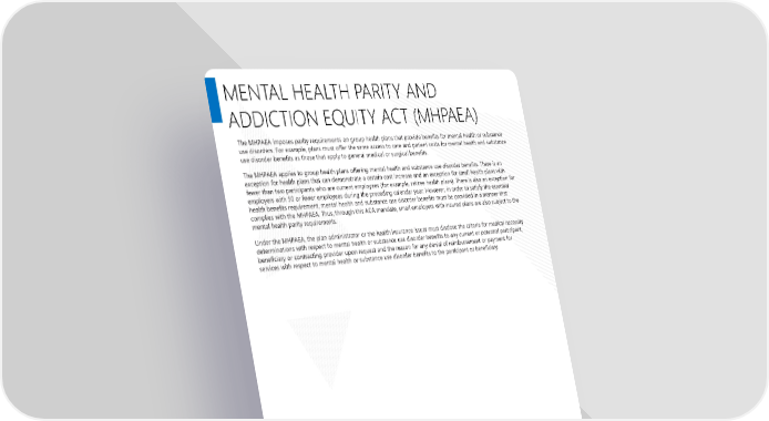 Page 16 | Jay School Corporation 2025 Compliance Bundle MENTAL HEALTH PARITY AND ADDICTION EQUITY ACT (MHPAEA) The MHPAEA imposes parity requirements on group health plans that provide benefits for mental health or substance use disorders. For example, plans must offer the same access to care and patient costs for mental health and substance use disorder benefits as those that apply to general medical or surgical benefits. The MHPAEA applies to group health plans offering mental health and substance use disorder benefits. There is an exception for health plans that can demonstrate a certain cost increase and an exception for small health plans with fewer than two participants who are current employees (for example, retiree health plans). There is also an exception for employers with 50 or fewer employees during the preceding calendar year. However, in order to satisfy the essential health benefits requirement, mental health and substance use disorder benefits must be provided in a manner that complies with the MHPAEA. Thus, through this ACA mandate, small employers with insured plans are also subject to the mental health parity requirements. Under the MHPAEA, the plan administrator or the health insurance issuer must disclose the criteria for medical necessity determinations with respect to mental health or substance use disorder benefits to any current or potential participant, beneficiary or contracting provider upon request and the reason for any denial of reimbursement or payment for services with respect to mental health or substance use disorder benefits to the participant or beneficiary.