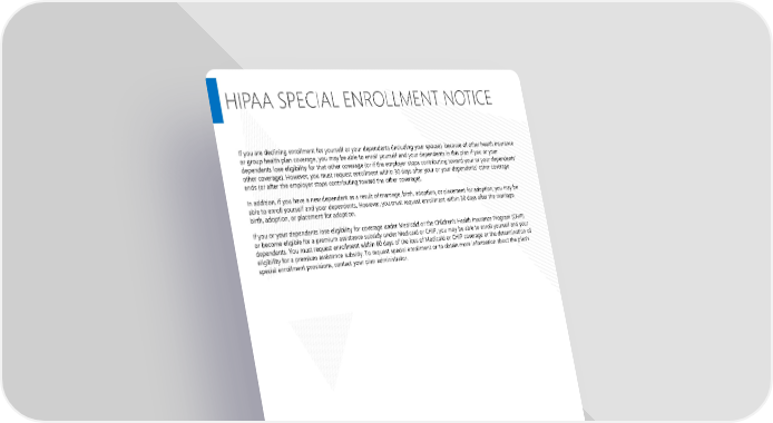 Page 8 | Jay School Corporation 2025 Compliance Bundle HIPAA SPECIAL ENROLLMENT NOTICE If you are declining enrollment for yourself or your dependents (including your spouse) because of other health insurance or group health plan coverage, you may be able to enroll yourself and your dependents in this plan if you or your dependents lose eligibility for that other coverage (or if the employer stops contributing toward your or your dependents’ other coverage). However, you must request enrollment within 30 days after your or your dependents’ other coverage ends (or after the employer stops contributing toward the other coverage). In addition, if you have a new dependent as a result of marriage, birth, adoption, or placement for adoption, you may be able to enroll yourself and your dependents. However, you must request enrollment within 30 days after the marriage, birth, adoption, or placement for adoption. If you or your dependents lose eligibility for coverage under Medicaid or the Children’s Health Insurance Program (CHIP) or become eligible for a premium assistance subsidy under Medicaid or CHIP, you may be able to enroll yourself and your dependents. You must request enrollment within 60 days of the loss of Medicaid or CHIP coverage or the determination of eligibility for a premium assistance subsidy. To request special enrollment or to obtain more information about the plan's special enrollment provisions, contact your plan administrator.