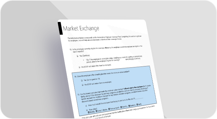 Market Exchange The information below corresponds to the Marketplace Employer Coverage Tool. Completing this section is optional for employers, but will help ensure employees understand their coverage choices. 13. Is the employee currently eligible for coverage offered by this employer, or will the employee be eligible in the next 3 months? Yes (Continue) • 13a. If the employee is not eligible today, including as a result of a waiting or probationary period, when is the employee eligible for coverage? (mm/dd/yyyy) (Continue) No (STOP and return this form to employee) 14. Does the employer offer a health plan that meets the minimum value standard*? Yes (Go to question 15) No (STOP and return form to employee) 15. For the lowest-cost plan that meets the minimum value standard* offered only to the employee (don't include family plans): If the employer has wellness programs, provide the premium that the employee would pay if he/she received the maximum discount for any tobacco cessation programs, and didn't receive any other discounts based on wellness programs. a) How much would the employee have to pay in premiums for this plan? $_______________ b) How often? Weekly Every 2 Weeks Twice a month Monthly Quarterly Yearly If the plan year will end soon and you know that the health plans offered will change, go to question 16. If you don't know, STOP and return form to employee. 16. What change will the employer make for the new plan year? Employer won't offer health coverage Employer will start offering health coverage to employees or change the premium for the lowest-cost plan available only to the employee that meets the minimum value standard.* (Premium should reflect the discount for wellness programs. See question 15.) a) How much would the employee have to pay in premiums for this plan? $_______________ b) How often? Weekly Every 2 Weeks Twice a month Monthly Quarterly Yearly * An employer-sponsored health plan meets the "minimum value standard" if the plan's share of the total allowed benefit costs covered by the plan is no less than 60 percent of such costs (Section 36B(c)(2)(C)(ii) of the Internal Revenue Code of 1986) Page 29 | DePauw University | Plan Year 2025 This Compliance Overview is not intended to be exhaustive nor should any discussion or opinions be construed as legal advice. Readers should contact legal counsel for legal advice.