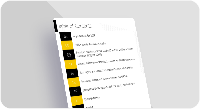 Table of Contents 03 Legal Notices for 2025 08 HIPAA Special Enrollment Notice 09 Premium Assistance Under Medicaid and the Children’s Health Insurance Program (CHIP) 13 Genetic Information Nondiscrimination Act (GINA) Disclosures 14 Your Rights and Protections Against Surprise Medical Bills 15 Employee Retirement Income Security Act (ERISA) 16 Mental Health Parity and Addiction Equity Act (MHPAEA) 17 USERRA Notice 18 COBRA 22 Family Medical Leave Act (FMLA) 24 2025 Medicare Part D Creditability Notice 26 Market Exchange 30 Notice Regarding Wellness Program 33 2023 Summary Annual Report Page 2 | DePauw University | Plan Year 2025 This Compliance Overview is not intended to be exhaustive nor should any discussion or opinions be construed as legal advice. Readers should contact legal counsel for legal advice.