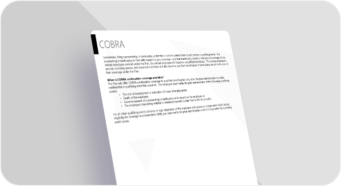 COBRA Sometimes, filing a proceeding in bankruptcy under title 11 of the United States Code can be a qualifying event. If a proceeding in bankruptcy is filed with respect to your employer, and that bankruptcy results in the loss of coverage of any retired employee covered under the Plan, the retired employee will become a qualified beneficiary. The retired employee’s spouse, surviving spouse, and dependent children will also become qualified beneficiaries if bankruptcy results in the loss of their coverage under the Plan. When is COBRA continuation coverage available? The Plan will offer COBRA continuation coverage to qualified beneficiaries only after the plan administrator has been notified that a qualifying event has occurred. The employer must notify the plan administrator of the following qualifying events: • The end of employment or reduction of hours of employment; • Death of the employee; • Commencement of a proceeding in bankruptcy with respect to the employer; or • The employee’s becoming entitled to Medicare benefits (under Part A, Part B, or both). For all other qualifying events (divorce or legal separation of the employee and spouse or a dependent child’s losing eligibility for coverage as a dependent child), you must notify the plan administrator within 60 days after the qualifying event occurs. Page 19 | DePauw University | Plan Year 2025 This Compliance Overview is not intended to be exhaustive nor should any discussion or opinions be construed as legal advice. Readers should contact legal counsel for legal advice.