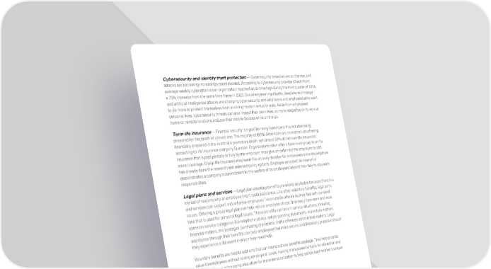 Cybersecurity and identify theft protection — Cybersecurity breaches are on the rise, and attacks are becoming increasingly sophisticated. According to cybersecurity provider Check Point, average weekly cyberattacks per organization reached an all-time high during the third quarter of 2024, a 75% increase from the same time frame in 2023. Social engineering attacks, deepfake technology and artificial intelligence attacks are changing cybersecurity, and employers and employees alike want to do more to protect themselves from evolving modern virtual threats. Aside from employees’ personal lives, cybersecurity threats can also impact their work lives, as more people log on to work at home or remote locations and use their mobile devices while on the go. Term life insurance — Financial security is a goal for many Americans; this includes being prepared for the death of a loved one. The majority of (80%) Americans are concerned about being financially prepared in the event of a premature death, yet almost 30% do not own life insurance, according to life insurance company Guardian. Organizations often offer a base-level group term life insurance that is paid partially or fully by the employer, then give an option for the employee to add more coverage. Group life insurance may seem like an easy decision for employees since the employer has already done the research and selected policy options. Employer-provided life insurance demonstrates a company’s commitment to the welfare of its employees beyond their day-to-day work responsibilities. Legal plans and services — Legal plan voluntary benefits are widely applicable because there is a myriad of reasons why an employee might need assistance. Like other voluntary benefits, legal plans and services can support and enhance employees’ lives outside of work as they deal with personal issues. Offering a group legal plan can help reduce employee stress, time away from work and work time that is used for personal legal issues. These benefits can help in various situations, including common service categories like telephone advice, estate planning documents, real estate matters, financial matters, the leasing or purchasing of a vehicle, traffic offenses and criminal matters. Legal assistance through their benefits can help employees feel more secure and financially prepared should they experience a life event in which they need help. Voluntary benefits are helpful add-ons that can round out any benefits package. They help provide value to employees without raising employers’ costs, making them powerful tools for attraction and retention. These extra perks also allow for more personalization to help satisfy each worker’s unique needs. 25