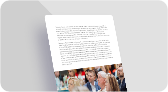 Because the telehealth relief has not been extended, HDHPs that have not imposed a deductible on telehealth services will need to start doing so for the plan year beginning on or after Jan. 1, 2025. This means that employees will be required to pay the cost of telemedicine services, other than preventive care, until the HDHP deductible is satisfied. Once their HDHP deductibles have been satisfied, employees can have access to free or low-cost medical benefits without jeopardizing their HSA eligibility. Any changes to telemedicine coverage should be communicated to plan participants through an updated SPD or a summary of material modifications. Employers should also keep cybersecurity in mind when selecting service providers for their health plans, including those that provide or facilitate telemedicine platforms. Recently, the U.S. Department of Labor (DOL) updated its cybersecurity guidance to ensure that all plans governed by ERISA, including health plans, follow best practices for protecting sensitive information. Most private-sector employers are subject to ERISA’s fiduciary rules when it comes to administrating their employee benefit plans. ERISA’s fiduciary rules require employers to prudently select and monitor plan service providers, such as third-party administrators. Because employers rely on health plan service providers to keep participant data confidential and secure, they should only select service providers that follow strong cybersecurity practices. Employers should review the DOL’s tips for hiring a service provider with strong cybersecurity practices and incorporate these best practices into their review of potential service providers. 12