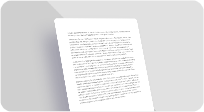 includes discrimination based on sexual orientation and gender identity. However, federal courts have issued injunctions blocking this portion of the rule from going into effect. In the interim, Section 1557 has been used as the grounds for discrimination in several lawsuits, where plaintiffs allege that their group health plan’s terms were discriminatory against certain participants based on their sexual orientation. Some courts have found in favor of these plaintiffs, ruling that the policies in question were written in a way where a significant portion of the LGBTQI+ community could not meet the definition of infertility without incurring out-of-pocket costs (whereas their straight counterparts could). Other courts have ruled that Section 1557 does not include discrimination based on sexual orientation. The litigation surrounding Section 1557’s definition of sex-based discrimination will be an area to watch in the context of reproductive health benefits heading into 2025. As states continue to navigate these issues, it’s important for employers to consider the challenges their employees may face in accessing fertility assistance services, as well as the financial strain they may experience in paying higher out-of-pocket costs without insurance coverage. Employers with employees in states without fertility coverage mandates (and particularly in states with abortion coverage restrictions) have started offering standalone reproductive health benefits, including covering related travel expenses. Others are enhancing coverage under their group health plans to ensure employees have access to reproductive health care. Employers providing benefits for fertility care in 2025 need to assess the implications of offering these benefits as state laws continue to evolve. For fully insured health plans, the scope of benefits that may be provided depends on the specific requirements imposed at the state level. In general, self-insured health plans are not subject to state insurance laws, giving such employers more flexibility to determine the scope of these benefits. In either case, careful consideration should be given to how infertility is defined under the plan’s terms, and employers should continue to closely monitor legal developments regarding the application of Section 1557. Being aware of the latest legal developments allows employers to stay compliant while providing meaningful benefits to align with their employees’ needs, which can be part of a robust employee attraction and retention strategy. 14