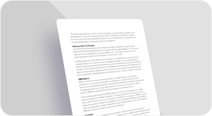 The FDA has approved around 40 CGT products. The agency is expected to approve between 10 and 20 treatments in 2025, and hundreds more are currently in clinical trials and could become available in the coming years. With more individuals eligible each year for treatments like CGT, employers will need to make decisions about coverage and mitigating cost exposures. Medicare Part D Changes As a result of the Inflation Reduction Act, the Medicare Drug Price Negotiation Program allows the federal government to negotiate the prices of drugs for Medicare-eligible individuals. The first round of negotiations concluded, and the new pricing is effective Jan. 1, 2026. Medicare will select up to 15 more drugs covered under Part D for negotiation in 2027 by Feb. 1, 2025. In addition, beginning in 2025, Medicare Part D plans will include a $2,000 cap on prescription drugs covered by the plan. This means that if plan participants incur $2,000 in out-of-pocket spending on covered drugs, eligible individuals will not have to pay for any additional drug costs for the remainder of the year. This will impact 53 million of the 67 million Medicare beneficiaries enrolled in Medicare Part D plans, including employer-sponsored plans. As a result, employer-sponsored group health plans that are required to offer creditable coverage are likely to experience increases in prescription drug costs. PBM Reform PBMs—entities that act as an intermediary between stakeholders in the pharmacy benefits marketplace—are currently in the spotlight as employers focus on ways to reduce costs while providing plan participants access to the treatments they need. PBMs function to lower drug costs by leveraging group purchasing, using volume discounts and passing on discounts from rebates. However, PBMs have received criticism due to transparency and pricing practices. There is broad support for revamping PBM practices, such as increasing transparency on rebates, detaching drug prices from PBM compensation and expediting generic drugs for some high-cost prescriptions. Individual states have enacted laws that adopted more regulations of PBMs, but there is bipartisan support for increased federal regulations that could impact how PBMs operate. In addition, there is pending litigation related to PBMs that could gain traction in federal courts in 2025. In general, PBM reform will be an area for employers to monitor this year. Summary The prescription drug market will continue to evolve in 2025 as costs rise and more specialty medications enter the market. Employees with common chronic conditions such as obesity and Type 2 diabetes now have access to more treatment options, and patients with advanced conditions such as cancer also have access to new medical treatments. However, these treatments won’t reach all employer-sponsored health plans. Emerging treatment options will require employers to determine which new prescription drug options they offer employees and how to do so cost-effectively. In 2025, employer efforts will likely turn to understanding these growing categories of specialty drugs, adjusting plan formularies and managing prescription drug benefits to balance workforce needs with the reality of rising drug costs. 23