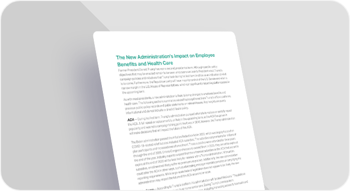 The New Administration’s Impact on Employee Benefits and Health Care Former President Donald Trump has won a second presidential term. Although specific policy objectives that may be enacted remain to be seen, employers can look to President-elect Trump’s campaign policies and initiatives that Trump took during his first term in office as an indication of what is to come. Furthermore, the Republican party will have majority control of the U.S. Senate and retain a narrow margin in the U.S. House of Representatives, which can significantly impact legislation passed in the upcoming term. As with most presidents, a new administration is likely to bring changes to employee benefits and health care. The following sections summarize related topics gathered from Trump’s official platforms, previous public policy records and public statements on relevant issues. Any insights are purely informational and do not indicate or predict future policy. ACA — During his first term, Trump’s administration pursued attempts to replace or partially repeal the ACA. A full repeal or replacement is unlikely in the upcoming term, as the ACA has grown in popularity and was not a campaign talking point like it was in 2016. However, the Trump administration will make decisions that will impact the future of the ACA. The Biden administration passed the Inflation Reduction Act in 2022, which was largely focused on COVID-19-related relief but also included ACA subsidies. The subsidies cut premiums for millions of plan participants and increased overall enrollment. These subsidies were extended for three years through the end of 2025. Unless Congress chooses to extend them in 2025, they are set to expire at the end of the year. Industry experts suspect that the enhanced subsidies on the ACA that are set to expire at the end of 2025 will be less likely for renewal with a Trump administration. Without the subsidies, enrollment will likely suffer as premiums skyrocket. Additionally, the new administration could alter the ACA in other ways, such as eliminating employer mandate penalties or simplifying the reporting requirements. While large-scale federal legislation does not appear to be likely, the new administration may impact the future of the ACA on a smaller scale. Medicare — According to Trump’s platform, his administration will “protect Medicare.” The platform also plans to shift resources back to at-home senior care. During Trump’s previous term, enhancements were made to Medicare Advantage plans, including increasing access to telehealth and expanding supplemental benefits for seniors with chronic diseases. In 2020, the Trump administration capped insulin to $35 per month through 2023 for qualifying Medicare Part D plans. Not all Part D plans participated. Next, the Biden administration passed a broader $35 insulin cap for Medicare participants through the Medicare Drug Price Negotiation Program. The Trump platform has indicated it will work to lower health care costs for health care and prescription drugs. While the Medicare program negotiations are currently set to continue, many are speculating about how these price negotiations might change under a Trump presidency. Medicaid — Medicaid is the third-largest program in the federal budget. While Trump campaigned on preserving Social Security and Medicare, Medicaid was not a key talking point for his campaign. Given Social Security and Medicare cuts are unlikely, reductions in Medicaid spending may become necessary to fund Trump’s tax cuts. Trump has previously supported efforts to cap or reduce Medicaid 26