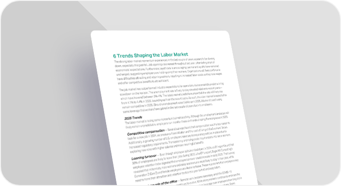 6 Trends Shaping the Labor Market The strong labor market momentum experienced in the last couple of years appears to be slowing down, especially this past fall. Job openings decreased throughout last year, often falling short of economists’ expectations. Furthermore, layoff data is encouraging; permanent layoffs have remained unchanged, suggesting employers are holding on to their workers. Organizations will likely continue to have difficulties attracting and retaining workers, resulting in increased labor costs as they raise wages and offer competitive benefits to attract talent. The job market has outperformed industry expectations for some time, but economists predict a hiring slowdown on the horizon. The unemployment rate is likely to stay elevated relative to recent years— which have hovered between 3%-4%. The latest market predictions show that the rate will likely rise from 4.1% to 4.4% in 2025, bouncing up from the recent cycle. As such, the labor market is expected to remain competitive in 2025. Should unemployment rates trickle up in 2025, this trend could swing some leverage that workers have gained in the last couple of years back to employers. 2025 Trends The labor market is losing some momentum but not crashing. Although the employment landscape will likely remain unpredictable, employers can monitor these six trends shaping the workplaces in 2025: Competitive compensation — Several surveys found that compensation was the top reason to look for a new job in 2024, as pressures from inflation and the cost of living shifted workers’ focus. Additionally, a growing number of U.S. employers have pay transparency policies in place due to increased regulatory requirements. Transparency and rising costs may translate into more workers exploring new roles with higher salaries and more meaningful benefits. Looming turnover — Even though employee quits trended down in 2024, an EY report found that 38% of employees are likely to leave their jobs during 2025. Like EY’s report, Eagle Hill Consulting’s employee retention index signaled that employee turnover could increase in early 2025. That survey revealed that millennials, male workers and baby boomers are most likely to stay in their jobs, while Generation Z (Gen Z) and female employees are likelier to leave. These reports hint that employers may need to hone their attraction and retention tactics this year to find and keep talent. The evolving role of the office — Remote work became necessary amid the COVID-19 pandemic, but the role of the office continues to evolve. While many workers continue to embrace the flexibility and autonomy of working from home, they have less leverage over employers than they did in previous years. Organizations are starting to take their own stance on working locations. Some employers fully support remote work, some encourage occasional on-site work for the sake of collaboration and innovation, and some are introducing return-to-office (RTO) mandates. A Resume Builder survey found that 23% of employers plan to implement an RTO policy by the end of 2025, and 7% plan to do so in 2026 or later. High-profile companies Amazon and Dell have already enacted policies to require employees to be on-site five days a week, and 3M is now scaling back its remote- friendly policy to bring employees at the director level and above back to the headquarters office three times a week for “collaboration days.” Reconfiguring the office and work policies will likely remain a problem for many organizations as they balance factors such as employee satisfaction, productivity, team collaboration and real estate footprints. Regardless, it seems the trend toward more time in the office is on the horizon. A survey by real estate company JLL found that nearly half (43%) of employers expect the number of in-office days to increase by 2030. As the push for full-time, in-office work 15