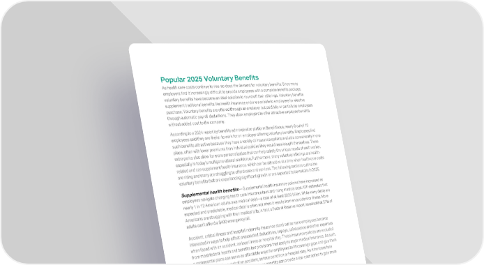 Popular 2025 Voluntary Benefits As health care costs continue to rise, so does the demand for voluntary benefits. Since many employers find it increasingly difficult to provide employees with a complete benefits package, voluntary benefits have become an ideal solution to round off their offerings. Voluntary benefits supplement traditional benefits like health insurance and are available to employees for elective purchase. Voluntary benefits are offered through an employer but paid fully or partially by employees through automatic payroll deductions. They allow employers to offer attractive employee benefits without added cost to the company. According to a 2024 report by benefits administration platform Benefitfocus, nearly 8 out of 10 employees said they are likelier to work for an employer offering voluntary benefits. Employees find such benefits attractive because they have a variety of insurance options available conveniently in one place, often with lower premiums than individual policies they would have bought themselves. These extra perks also allow for more personalization that can help satisfy the unique needs of each worker, especially in today’s multigenerational workforce. Furthermore, many voluntary offerings are health- related and can supplement health insurance, which can be attractive at a time when health care costs are rising and many are struggling to afford care and services. The following sections outline the voluntary benefits that are experiencing significant growth or are expected to be notable in 2025. Supplemental health benefits — Supplemental health insurance policies have increased as employees navigate changing health care insurance laws and rising medical debt. KFF estimates that nearly 1 in 12 American adults owe medical debt—a total of at least $220 billion. While many debts are expected and predictable, medical debt is often not when it results from an accident or illness. More Americans are struggling with their medical bills; in fact, a Federal Reserve report revealed that 37% of adults can’t afford a $400 emergency bill. Accident, critical illness and hospital indemnity insurance stand out as more employees become interested in ways to help offset unexpected deductibles, copays, coinsurance and other expenses when faced with an accident, serious illness or hospital stay. These insurance policies are excluded from most federal health and benefits law provisions that apply to major medical insurance. As such, supplemental plans can serve as affordable ways for employees to fill coverage gaps and give them peace of mind in the event of an accident, serious condition or hospital stay. As Americans face another year of rising health care costs, these benefits can provide a low-cost option to gain more coverage. Student loan repayment assistance — The Pew Research Center reported that 1 in 4 U.S. adults under 40 have student loan debt. Educational assistance programs have traditionally been used to pay for employees’ books, supplies, tuition and other education-related expenses. However, these programs can now also be used to pay principal and interest on an employee’s qualified education loans. Payments made directly to the lender, as well as those made to the employee, may qualify. The ability to use educational assistance programs to pay for student loans is set to expire Dec. 31, 2025. Until then, employers can offer up to $5,250 in student loan repayment benefits tax-free. As employees increasingly look to their employers for student loan assistance, employers who don’t have an educational assistance program may want to consider establishing one to take advantage of the current student loan provision before it expires. 24