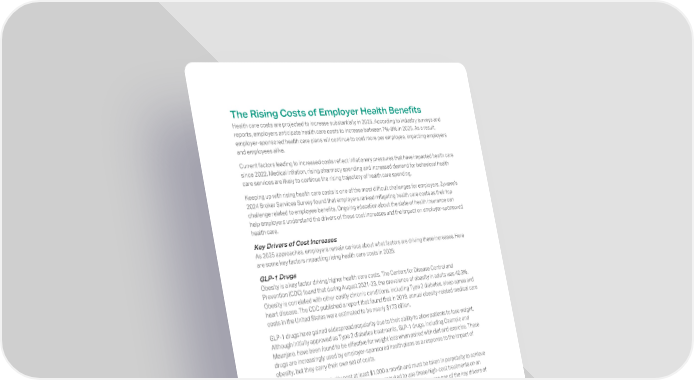 The Rising Costs of Employer Health Benefits Health care costs are projected to increase substantially in 2025. According to industry surveys and reports, employers anticipate health care costs to increase between 7%-8% in 2025. As a result, employer-sponsored health care plans will continue to cost more per employee, impacting employers and employees alike. Current factors leading to increased costs reflect inflationary pressures that have impacted health care since 2022. Medical inflation, rising pharmacy spending and increased demand for behavioral health care services are likely to continue the rising trajectory of health care spending. Keeping up with rising health care costs is one of the most difficult challenges for employers. Zywave’s 2024 Broker Services Survey found that employers ranked mitigating health care costs as their top challenge related to employee benefits. Ongoing education about the state of health insurance can help employers understand the drivers of these cost increases and the impact on employer-sponsored health care. Key Drivers of Cost Increases As 2025 approaches, employers remain curious about what factors are driving these increases. Here are some key factors impacting rising health care costs in 2025: GLP-1 Drugs Obesity is a key factor driving higher health care costs. The Centers for Disease Control and Prevention (CDC) found that during August 2021-23, the prevalence of obesity in adults was 40.3%. Obesity is correlated with other costly chronic conditions, including Type 2 diabetes, sleep apnea and heart disease. The CDC published a report that found that in 2019, annual obesity-related medical care costs in the United States were estimated to be nearly $173 billion. GLP-1 drugs have gained widespread popularity due to their ability to allow patients to lose weight. Although initially approved as Type 2 diabetes treatments, GLP-1 drugs, including Ozempic and Mounjaro, have been found to be effective for weight loss when paired with diet and exercise. These drugs are increasingly used by employer-sponsored health plans as a response to the impact of obesity, but they carry their own set of costs. GLP-1 medications typically cost at least $1,000 a month and must be taken in perpetuity to achieve their benefits. This means that GLP-1 users are required to use these high-cost treatments on an ongoing basis. With GLP-1s being used by more plan participants, they are one of the key drivers of rising health care costs. Specialty Medications Drugs that fall under categories such as immunosuppressants, cell and gene therapies (CGT), biologics and antivirals are responsible for a significant portion of overall health care spend. For example, biological drugs are one of the fastest-growing categories of pharmacy spending. According to a report published in the medical journal JAMA, biologics make up only 2% of prescriptions but account for 37% of net drug spending. Other specialty treatments, such as CGT, can carry an even greater cost. Some treatments may cost thousands of dollars per week; others can cost between $250,000 and $4.25 million for a single dose. By 2025, it’s estimated that nearly 100,000 patients in the United States will be eligible for CGT, which could cost $25 billion. 6