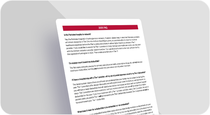 2025 FAQ Is the Parkview hospital in network? Yes, the Parkview hospital in Huntington is in-network. However, please keep in mind that Parkview providers will almost always be in Tier 2 for the Anthem HealthSync plans, so your deductible to meet for covered healthcare expenses before the Plan’s coinsurance kicks in will be higher than if you choose a Tier 1 provider. If you would like to search for Tier 1 providers to help manage your healthcare costs, you may start with the Anthem website’s provider search function. Tip: a great place to start is the new Lutheran facility that opened in Huntington in 2024. Their onsite providers are in Tier 1! Do copays count toward my deductible? The nat copay amounts you pay for primary care physician visits, prescription drugs, etc. will not help you reach your deductible, but they are factored into your annual out of pocket maximum. If I have a hospital stay with a Tier 1 provider, will my out of pocket expenses count to my Tier 2 deductible? The tiered system means there are diferent annual deductibles your family may be subject to during the year. Tier 1 providers ofer deeper discounts and will result in lower costs for both you and the insurer, so you will have a lower deductible that will need to be met for non-copay services such as inpatient hospital stays. Tier 2 providers are more expensive, so if you receive care from one you will be subject to a higher deductible for the year. If you incur expenses with a Tier 1 provider and later visit a Tier 2 provider, the out of pocket costs you paid in Tier 1 will be honored to the Tier 2 deductible; however, Tier 2 expenses will not be honored toward your Tier 1 deductible. What does it mean for a deductible to be embedded or non-embedded? Embedded and non-embedded deductibles apply when you have family members as dependents on your medical plan. With a non-embedded deductible, the family has one big deductible that collectively has to be met before the plan’s coinsurance begins. One family member could theoretically meet the whole family’s deductible on their own! With an embedded deductible, each family member has their own smaller share of the deductible. When that family member meets their own deductible, the Plan begins to pay coinsurance for their remaining expenses, even if other family members are still working on their own shares of the deductible. Are we still using Garner Health for HRA incentives? No. HCCSC is pivoting away from beneots such as HSAs and HRA incentives for the 2025 plan year and instead focusing on redesigning the medical plan to bring you orst-dollar coverage from the insurance carrier. Review your RelayTo beneot guide website to learn about the new medical plans available to you.