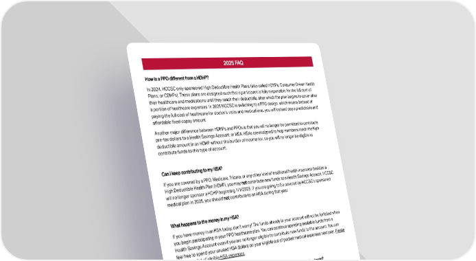 2025 FAQ How is a PPO diferent from a HDHP? In 2024, HCCSC only sponsored High Deductible Health Plans (also called HDHPs, Consumer Driven Health Plans, or CDHPs). These plans are designed such that a participant is fully responsible for the full cost of their healthcare and medications until they reach their deductible, after which the plan begins to cover all or a portion of healthcare expenses. In 2025 HCCSC is switching to a PPO design, which means instead of paying the full cost of healthcare for doctor’s visits and medications, you will instead pay a predictable and afordable oxed copay amount. Another major diference between HDHPs and PPOs is that you will no longer be permitted to contribute pre-tax dollars to a Health Savings Account, or HSA. HSAs are designed to help members reach the high deductible amount in an HDHP without the burden of income tax, so you will no longer be eligible to contribute funds to this type of account. Can I keep contributing to my HSA? If you are covered by a PPO, Medicare, Tricare, or any other kind of traditional health insurance besides a High Deductible Health Plan (HDHP), you may not contribute new funds to a Health Savings Account. HCCSC will no longer sponsor a HDHP beginning 1/1/2025. If you are going to be covered by HCCSC’s sponsored medical plan in 2025, you should not contribute to an HSA during that year. What happens to the money in my HSA? If you have money in an HSA today, don’t worry! The funds already in your account will not be forfeited when you begin participating in your PPO healthcare plan. You can continue spending available funds from a Health Savings Account even if you are no longer eligible to contribute new funds to the account. You can feel free to spend your unused HSA dollars on your eligible out of pocket medical expenses next year. Please review this list of eligible HSA expenses. Is there an alternative to an HSA I can use to pay for medical expenses on a pre-tax basis? Yes! Now that you will be enrolled in a PPO, you may be eligible to participate in a traditional Healthcare Flexible Spending Account (FSA). You can sign up with an FSA provider of your choosing, or you can get in contact with American Fidelity before 12/31/2024 to sign up for their FSA product.