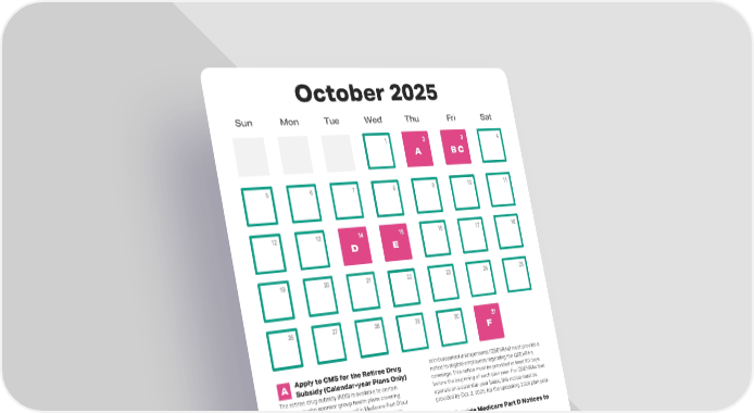 October 2025 Sun Mon Tue Wed Thu Fri Sat Apply to CMS for the Retiree Drug reimbursement arrangements (QSEHRAs) must provide a A Subsidy (Calendar-year Plans Only) notice to eligible employees regarding the QSEHRA’s The retiree drug subsidy (RDS) is available to certain coverage. This notice must be provided at least 90 days employers who sponsor group health plans covering before the beginning of each plan year. For QSEHRAs that retirees who are entitled to enroll in Medicare Part D but operate on a calendar-year basis, this notice must be elect not to do so. To participate in the RDS program, provided by Oct. 3, 2025, for the upcoming 2026 plan year. eligible employers must submit an application to CMS Provide Medicare Part D Notices to before the beginning of the plan year by a date specified D Plan Participants by CMS (usually about 90 days before the beginning of the Notify Medicare Part D eligible individuals by Oct. 14, plan year). The approximate deadline is Oct. 2, 2025, for 2025, whether the health plan’s prescription drug plan years beginning on Jan. 1, 2026. This deadline may be coverage is creditable or non-creditable. extended by 30 days if CMS grants an extension. Provide ICHRA Notice for 2026 Plan File Form 5500 for the 2024 Plan B Year E Year if Form 5500 Deadline Was Employers that offer individual coverage health Extended reimbursement arrangements (ICHRAs) must provide a File Form 5500 with the DOL by Oct. 15, 2025, if you have notice to eligible employees regarding the ICHRA’s a calendar-year plan and applied for the automatic 2.5- coverage. This notice must be provided at least 90 days month filing extension. before the beginning of each plan year. For ICHRAs that File Form 941, Employer’s Quarterly operate on a calendar-year basis, this notice must be F Federal Tax Return provided by Oct. 3, 2025, for the upcoming 2026 plan year. A model notice is available for employers to use. File Form 941 with the IRS by Oct. 31, 2025, to report the federal income tax, Social Security tax and Medicare tax C Provide QSEHRA Notice for the 2026 you withheld from your employees’ pay during the third Plan Year (Calendar-year quarter of 2025 (July, August and September). If your Plans Only) company was timely in depositing all taxes when they were Employers that offer qualified small employer health due, the filing deadline is extended to Nov. 10, 2025.