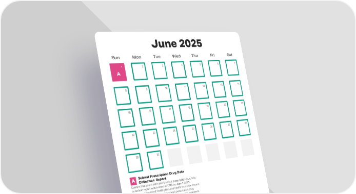June 2025 Sun Mon Tue Wed Thu Fri Sat 1 A A Submit Prescription Drug Data Collection Report Confirm that your health plan’s annual prescription drug data collection report is submitted to CMS by June 1, 2025. Employer-sponsored health plans and health insurance issuers must annually report information about prescription drug spending to the federal government. This reporting process is referred to as the “prescription drug data collection” (or “RxDC report”). Most employers rely on third parties, such as issuers, third-party administrators (TPAs) or pharmacy benefit managers, to prepare and submit the RxDC report for their health plans.