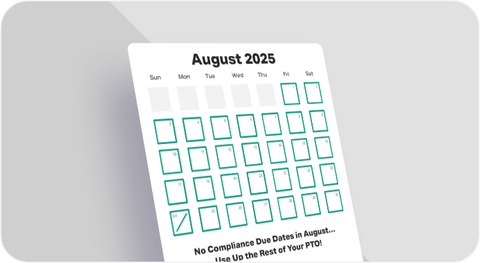 2025 HR Compliance Calendar Page 9 Page 11August 2025 Sun Mon Tue Wed Thu Fri Sat No Compliance Due Dates in August… Use Up the Rest of Your PTO!