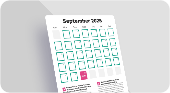 September 2025 Sun Mon Tue Wed Thu Fri Sat 30 A B A Provide SAR to Plan Participants B Watch for MLR Rebates (Fully- (Calendar-year Plans Only) if Form Insured Health Plans Only) 5500 Deadline Was Not Extended Employers with insured health plans might receive rebates Provide a summary annual report (SAR) to plan if their issuers did not meet their medical loss ratio (MLR) participants by Sept. 30, 2025, for calendar-year plans if percentage for 2024. Rebates must be provided by Sept. the employee benefit plan’s Form 5500 deadline is not 30 following the end of the MLR reporting year. Employers extended. The SAR must be provided within nine months who receive rebates should consider their legal options of the close of the plan year unless the plan’s Form 5500 for using the rebate. Any rebate amount that qualifies as a deadline is extended. Plans exempt from the annual 5500 plan asset under ERISA must be used for the exclusive filing requirement are not required to provide an SAR. benefit of the plan’s participants and beneficiaries. Also, Unfunded welfare plans are also generally exempt from as a general rule, plan sponsors should use the plan asset the SAR requirement. portion of the rebate within three months of receiving it to avoid ERISA’s trust requirements.