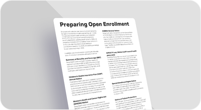 Preparing Open Enrollment Employers with calendar-year plans should start preparing COBRA General Notice for open enrollment for the plan year starting Jan. 1, 2026. Group health plans must provide a written General Notice This process should include reviewing your company’s of COBRA Rights to covered employees within 90 days benefit offerings, working with vendors to make any after their health plan coverage begins. Employers may benefit adjustments, updating benefit limits for 2026 and include the General Notice in their open enrollment preparing employee communications. If your company is materials to ensure that employees who newly enroll an ALE, you also may need to adjust employee during open enrollment receive the notice on a timely contributions based on the ACA’s affordability percentage basis. The DOL has a COBRA Model General Notice for for plan years beginning in 2026. employers to use; In addition, you should consider providing the following bene- fit notices in connection with open enrollment: HIPAA Privacy Notice (self-insured health plans only) Summary of Benefits and Coverage (SBC) The HIPAA Privacy Rule requires self-insured health plans Group health plans and health insurance issuers are to maintain and provide their own privacy notices. Self- required to provide an SBC to applicants and enrollees insured health plans are required to send privacy notices each year at open enrollment or renewal time. Federal at certain times, including to new enrollees at the time of agencies have provided a template for the SBC, which enrollment. Thus, the privacy notice should be included health plans and issuers are required to use; with the plan’s open enrollment materials. Also, at least once every three years, health plans must either Children’s Health Insurance Plan (CHIP) redistribute the privacy notice or notify participants that Annual Notice the privacy notice is available and explain how to obtain a If your group health plan covers residents in a state that copy. The Department of Health and Human Services provides a premium subsidy under a Medicaid plan or (HHS) has model privacy notices for employers to use; CHIP, send an annual notice about the available assistance to all employees residing in that state. The annual CHIP Special Enrollment Rights Notice notice can be provided any time during the year, but it is At or before enrollment, a group health plan must provide often included with the plan’s open enrollment materials. each eligible employee with a notice of their special The DOL has a model notice for employers to use; enrollment rights under HIPAA. This notice is often included in the plan’s SPD or benefits booklet provided by Women’s Health and Cancer Rights Act the issuer or TPA; (WHCRA) Notice Group health plans must provide a notice about the Notice of Patient Protections WHCRA’s coverage requirements at the time of enrollment If a health plan requires participants to designate a and annually after enrollment. The annual WHCRA notice participating primary care provider, the plan or issuer must can be provided at any time during the year, but it is often provide a notice of patient protections whenever the SPD included with the plan’s open enrollment materials. or similar description of benefits is provided to a Employers that redistribute their summary plan participant. This notice is often included in the SPD or descriptions (SPDs) each year can satisfy the annual benefits booklet provided by the issuer or TPA (or notice requirement by including the WHCRA notice in their otherwise provided with enrollment materials). The DOL SPDs. Model language is available in the DOL’s model has a model notice for employers to use; notice guide; Grandfathered Plan Notice SPD Companies with grandfathered health plans must include a An SPD must be provided to new plan participants within statement of the plan’s grandfathered status in plan 90 days of the date their coverage begins. Employers may materials provided to participants describing the plan’s include the SPD in their open enrollment materials to make benefits (such as open enrollment materials). The DOL has sure employees newly enrolled employees receive the a model notice for employers to use. SPD on a timely basis. Also, an employer should include the SPD with its enrollment materials if it includes notices that are required to be provided at the time of enrollment, such as the WHCRA notice;