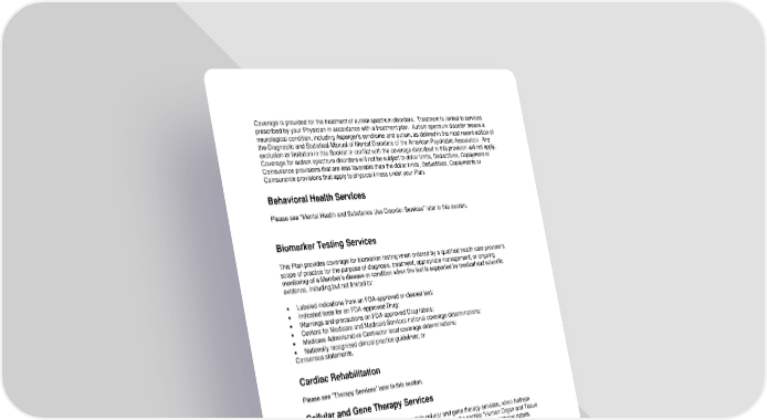38 Coverage is provided for the treatment of autism spectrum disorders. Treatment is limited to services prescribed by your Physician in accordance with a treatment plan. Autism spectrum disorder means a neurological condition, including Asperger's syndrome and autism, as defined in the most recent edition of the Diagnostic and Statistical Manual of Mental Disorders of the American Psychiatric Association. Any exclusion or limitation in this Booklet in conflict with the coverage described in this provision will not apply. Coverage for autism spectrum disorders will not be subject to dollar limits, Deductibles, Copayment or Coinsurance provisions that are less favorable than the dollar limits, Deductibles, Copayments or Coinsurance provisions that apply to physical illness under your Plan. Behavioral Health Services Please see “Mental Health and Substance Use Disorder Services” later in this section. Biomarker Testing Services This Plan provides coverage for biomarker testing when ordered by a qualified health care provider’s scope of practice for the purpose of diagnosis, treatment, appropriate management, or ongoing monitoring of a Member’s disease or condition when the test is supported by medical and scientific evidence, including but not limited to: • Labeled indications from an FDA-approved or cleared test; • Indicated tests for an FDA-approved Drug; • Warnings and precautions on FDA-approved Drug labels; • Centers for Medicare and Medicaid Services national coverage determinations; • Medicare Administrative Contractor local coverage determinations; • Nationally recognized clinical practice guidelines; or Consensus statements. Cardiac Rehabilitation Please see “Therapy Services” later in this section. Cellular and Gene Therapy Services Standard: Your Plan includes benefits for certain cellular and gene therapy services, when Anthem approves the benefits in advance through Precertification. See the section “Human Organ and Tissue Transplant (Bone Marrow / Stem Cell), Cellular and Gene Therapy Services” for additional details. Chemotherapy Please see “Therapy Services” later in this section. Chronic Pain Management Services Evidence based health care products and services intended to relieve chronic pain that has lasted for at least three (3) months are covered under this Plan. This includes: • Prescription drugs; • Physical Therapy; • Occupational Therapy;