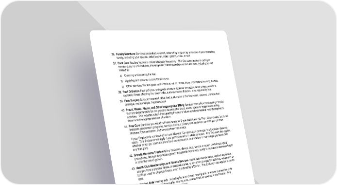 65 36. Family Members Services prescribed, ordered, referred by or given by a member of your immediate family, including your spouse, child, brother, sister, parent, in-law, or self. 37. Foot Care Routine foot care unless Medically Necessary. This Exclusion applies to cutting or removing corns and calluses; trimming nails; cleaning and preventive foot care, including but not limited to: a) Cleaning and soaking the feet. b) Applying skin creams to care for skin tone. c) Other services that are given when there is not an illness, injury or symptom involving the foot. 38. Foot Orthotics Foot orthotics, orthopedic shoes or footwear or support items unless used for a systemic illness affecting the lower limbs, such as severe diabetes, or as required by law. 39. Foot Surgery Surgical treatment of flat feet; subluxation of the foot; weak, strained, unstable feet; tarsalgia; metatarsalgia; hyperkeratosis. 40. Fraud, Waste, Abuse, and Other Inappropriate Billing Services from a Non-Participating Provider that are determined to be not payable as a result of fraud, waste, abuse or inappropriate billing activities. This includes a Non-Participating Provider's failure to submit medical records required to determine the appropriateness of a claim. 41. Free Care Services you would not have to pay for if you didn’t have this Plan. This includes, but is not limited to government programs, services during a jail or prison sentence, services you get from Workers’ Compensation, and services from free clinics. If your Employer is not required to have Workers’ Compensation coverage, this Exclusion does not apply. This Exclusion will apply if you get the benefits in whole or in part. This Exclusion also applies whether or not you claim the benefits or compensation, and whether or not you get payments from any third party. 42. Growth Hormone Treatment Any treatment, device, drug, service or supply (including surgical procedures, devices to stimulate growth and growth hormones), solely to increase or decrease height or alter the rate of growth. 43. Health Club Memberships and Fitness Services Health club memberships, workout equipment, charges from a physical fitness or personal trainer, or any other charges for activities, equipment, or facilities used for physical fitness, even if ordered by a Doctor. This Exclusion also applies to health spas. 44. Hearing Aids Hearing aids , including bone-anchored hearing aids, or exams to prescribe or fit hearing aids and over-the-counter hearing aids, unless listed as covered in this Booklet. This Exclusion does not apply to cochlear implants. 45. Home Health Care a) Services given by registered nurses and other health workers who are not employees of or working under an approved arrangement with a Home Health Care Provider. b) Private duty nursing. c) Food, housing, homemaker services and home delivered meals. 46. Hospital Services Billed Separately Services rendered by Hospital resident Doctors or interns that are billed separately. This includes separately billed charges for services rendered by employees of Hospitals, labs or other institutions, and charges included in other duplicate billings. 47. Hyperhidrosis Treatment Medical and surgical treatment of excessive sweating (hyperhidrosis). 48. Infertility Treatment Testing or treatment related to infertility.