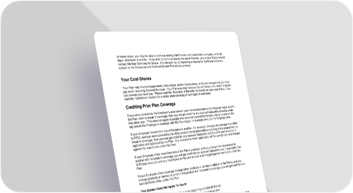 30 In these cases, you may be able to continue seeing that Provider until treatment is complete, or for 90 days, whichever is shorter. If you wish to continue seeing the same Provider, you or your Doctor should contact Member Services for details. Any decision by us regarding a request for Continuity of Care is subject to the Grievance and External Review Procedures process. Your Cost-Shares Your Plan may involve Copayments, Deductibles, and/or Coinsurance, which are charges that you must pay when receiving Covered Services. Your Plan may also have an Out-of-Pocket Limit, which limits the cost-shares you must pay. Please read the “Schedule of Benefits” for details on your cost-shares. Also read the “Definitions” section for a better understanding of each type of cost share. Crediting Prior Plan Coverage If you were covered by the Employer’s prior carrier / plan immediately before the Employer signs up with the Plan, with no break in coverage, then you will get credit for any accrued Deductible amounts under that other plan. This does not apply to people who were not covered by the prior carrier or plan on the day before the Employer’s coverage with the Plan began, or to people who join the Employer later. If your Employer moves from one of the plans to another, (for example, changes its coverage from HMO to PPO), and you were covered by the other product immediately before enrolling in this product with no break in coverage, then you may get credit for any accrued Deductible and Out-of-Pocket amounts, if applicable and approved by the Plan. Any maximums, when applicable, will be carried over and charged against the maximums under this Plan. If your Employer offers more than one of the Plan’s products, and you change from one product to another with no break in coverage, you will get credit for any accrued Deductible and, if applicable, Out- of-Pocket amounts and any maximums will be carried over and charged against maximums under this Plan. If your Employer offers coverage through other products or carriers in addition to the Plan’s, and you change products or carriers to enroll in this product with no break in coverage, you will get credit for any accrued Deductible, under this Plan. This Section Does Not Apply To You If: • Your Employer moves to this Plan at the beginning of a Benefit Period; • You change from one of the Plan’s individual policies to a group plan; • You change employers; or • You are a new Member who joins the Employer after the Employer's initial enrollment with the Plan. The BlueCard Program Like all Blue Cross & Blue Shield plans throughout the country, the Plan participates in a program called "BlueCard" which provides services to you when you are outside the Plan’s Service Area. For more details on this program, please see “Inter-Plan Arrangements” in the “Claims Payment” section. Identification Card The Plan will give an Identification Card to each Member enrolled in the Plan. When you get care, you must show your Identification Card. Only covered Members have the right to services or benefits under this Booklet. If anyone gets services or benefits to which they are not entitled to under the terms of this Booklet, he/she must pay for the actual cost of the services.