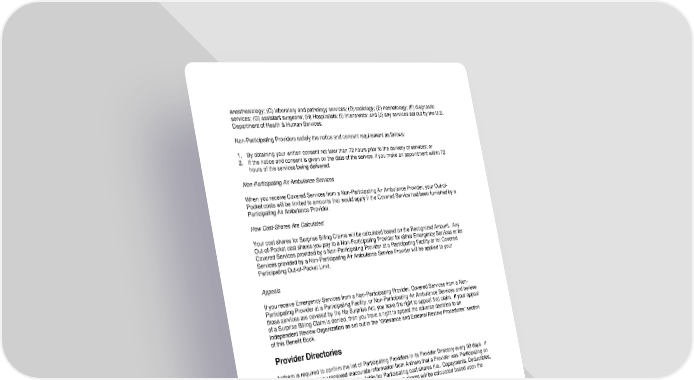2 anesthesiology; (C) laboratory and pathology services; (D) radiology; (E) neonatology; (F) diagnostic services; (G) assistant surgeons; (H) Hospitalists; (I) Intensivists; and (J) any services set out by the U.S. Department of Health & Human Services. Non-Participating Providers satisfy the notice and consent requirement as follows: 1. By obtaining your written consent not later than 72 hours prior to the delivery of services; or 2. If the notice and consent is given on the date of the service, if you make an appointment within 72 hours of the services being delivered. Non-Participating Air Ambulance Services When you receive Covered Services from a Non-Participating Air Ambulance Provider, your Out-of- Pocket costs will be limited to amounts that would apply if the Covered Service had been furnished by a Participating Air Ambulance Provider. How Cost-Shares Are Calculated Your cost shares for Surprise Billing Claims will be calculated based on the Recognized Amount. Any Out-of-Pocket cost shares you pay to a Non-Participating Provider for either Emergency Services or for Covered Services provided by a Non-Participating Provider at a Participating Facility or for Covered Services provided by a Non-Participating Air Ambulance Service Provider will be applied to your Participating Out-of-Pocket Limit. Appeals If you receive Emergency Services from a Non-Participating Provider, Covered Services from a Non- Participating Provider at a Participating Facility, or Non-Participating Air Ambulance Services and believe those services are covered by the No Surprise Act, you have the right to appeal that claim. If your appeal of a Surprise Billing Claim is denied, then you have a right to appeal the adverse decision to an Independent Review Organization as set out in the “Grievance and External Review Procedures” section of this Benefit Book. Provider Directories Anthem is required to confirm the list of Participating Providers in its Provider Directory every 90 days. If you can show that you received inaccurate information from Anthem that a Provider was Participating on a particular claim, then you will only be liable for Participating cost shares (i.e., Copayments, Deductibles, and/or Coinsurance) for that claim. Your Participating cost-shares will be calculated based upon the Maximum Allowed Amount. Transparency Requirements Anthem provides the following information on its website (i.e., www.anthem.com): Protections with respect to Surprise Billing Claims by Providers, including information on how to contact state and federal agencies if you believe a Provider has violated the No Surprises Act. You may also obtain the following information on Anthem’s website or by calling Member Services at the phone number on the back of your ID card: • Cost sharing information for covered items, services, and drugs , as required by the Centers for Medicare & Medicaid Services (CMS); and • A listing / directory of all Participating Providers.