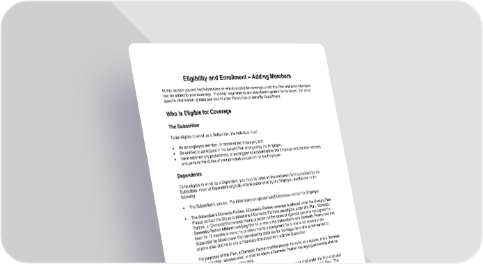 91 Eligibility and Enrollment – Adding Members In this section you will find information on who is eligible for coverage under this Plan and when Members can be added to your coverage. Eligibility requirements are described in general terms below. For more specific information, please see your Human Resources or Benefits Department. Who is Eligible for Coverage The Subscriber To be eligible to enroll as a Subscriber, the individual must: • Be an employee member, or retiree of the Employer, and: • Be entitled to participate in the benefit Plan arranged by the Employer; • Have satisfied any probationary or waiting period established by the Employer and (for non-retirees) and perform the duties of your principal occupation for the Employer; Dependents To be eligible to enroll as a Dependent, you must be listed on the enrollment form completed by the Subscriber, meet all Dependent eligibility criteria established by the Employer, and be one of the following: • The Subscriber's spouse. For information on spousal eligibility please contact the Employer. • The Subscriber’s Domestic Partner, if Domestic Partner coverage is allowed under the Group’s Plan. Please contact the Group to determine if Domestic Partners are eligible under this Plan. Domestic Partner, or Domestic Partnership means a person of the same or opposite sex who has signed the Domestic Partner Affidavit certifying that he or she is the Subscriber’s sole Domestic Partner and has been for 12 months or more; he or she is mentally competent; he or she is not related to the Subscriber by blood closer than permitted by state law for marriage; he or she is not married to anyone else; and he or she is financially interdependent with the Subscriber. For purposes of this Plan, a Domestic Partner shall be treated the same as a spouse, and a Domestic Partner’s child, adopted child, or child for whom a Domestic Partner has legal guardianship shall be treated the same as any other child. Any federal or state law that applies to a Member who is a spouse or child under this Plan shall also apply to a Domestic Partner or a Domestic Partner’s child who is a Member under this Plan. This includes but is not limited to, COBRA, FMLA, and COB. A Domestic Partner’s or a Domestic Partner’s child’s coverage ends on the date of dissolution of the Domestic Partnership. To apply for coverage as Domestic Partners, both the Subscriber and the Domestic Partner must complete and sign the Affidavit of Domestic Partnership in addition to the Enrollment Application, and must meet all criteria stated in the Affidavit. Signatures must be witnessed and notarized by a notary public. The Employer reserves the right to make the ultimate decision in determining eligibility of the Domestic Partner. • The Subscriber’s or the Subscriber’s spouse’s children, including natural children, stepchildren, newborn and legally adopted children and children who the Employer has determined are covered under a Qualified Medical Child Support Order as defined by ERISA or any applicable state law. • Children for whom the Subscriber or the Subscriber’s spouse is a legal guardian or as otherwise required by law.