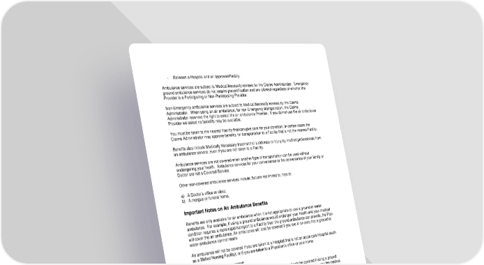 37 - Between a Hospital and an approved Facility. Ambulance services are subject to Medical Necessity reviews by the Claims Administrator. Emergency ground ambulance services do not require precertification and are allowed regardless of whether the Provider is a Participating or Non-Participating Provider. Non-Emergency ambulance services are subject to Medical Necessity reviews by the Claims Administrator. When using an air ambulance, for non-Emergency transportation, the Claims Administrator reserves the right to select the air ambulance Provider. If you do not use the air ambulance Provider we select no benefits may be available. You must be taken to the nearest Facility that can give care for your condition. In certain cases the Claims Administrator may approve benefits for transportation to a Facility that is not the nearest Facility. Benefits also include Medically Necessary treatment of a sickness or injury by medical professionals from an ambulance service, even if you are not taken to a Facility. Ambulance services are not covered when another type of transportation can be used without endangering your health. Ambulance services for your convenience or the convenience of your family or Doctor are not a Covered Service. Other non-covered ambulance services include, but are not limited to, trips to: a) A Doctor’s office or clinic; b) A morgue or funeral home. Important Notes on Air Ambulance Benefits Benefits are only available for air ambulance when it is not appropriate to use a ground or water ambulance. For example, if using a ground ambulance would endanger your health and your medical condition requires a more rapid transport to a Facility than the ground ambulance can provide, the Plan will cover the air ambulance. Air ambulance will also be covered if you are in an area that a ground or water ambulance cannot reach. Air ambulance will not be covered if you are taken to a Hospital that is not an acute care Hospital (such as a Skilled Nursing Facility), or if you are taken to a Physician’s office or your home. Hospital to Hospital Transport If you are moving from one Hospital to another, air ambulance will only be covered if using a ground ambulance would endanger your health and if the Hospital that first treats cannot give you the medical services you need. Certain specialized services are not available at all Hospitals. For example, burn care, cardiac care, trauma care, and critical care are only available at certain Hospitals. To be covered, you must be taken to the closest Hospital that can treat you. Coverage is not available for air ambulance transfers simply because you, your family, or your Provider prefers a specific Hospital or Physician. Athletic Trainer Services Your Plan covers services from an Athletic Trainer who is licensed under applicable state law and provides physical medicine and rehabilitative services within their scope of practice. Autism Spectrum Disorder Services