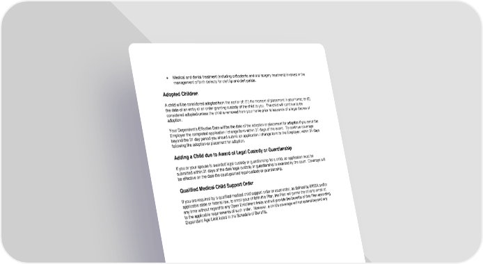 94 • Medical and dental treatment (including orthodontic and oral surgery treatment) involved in the management of birth defects for cleft lip and cleft palate. Adopted Children A child will be considered adopted from the earlier of: (1) the moment of placement in your home; or (2) the date of an entry of an order granting custody of the child to you. The child will continue to be considered adopted unless the child is removed from your home prior to issuance of a legal decree of adoption. Your Dependent’s Effective Date will be the date of the adoption or placement for adoption if you send the Employer the completed application / change form within 31 days of the event. To continue coverage beyond the 31 day period you should submit an application / change form to the Employer, within 31 days following the adoption or placement for adoption. Adding a Child due to Award of Legal Custody or Guardianship If you or your spouse is awarded legal custody or guardianship for a child, an application must be submitted within 31 days of the date legal custody or guardianship is awarded by the court. Coverage will be effective on the date the court granted legal custody or guardianship. Qualified Medical Child Support Order If you are required by a qualified medical child support order or court order, as defined by ERISA and/or applicable state or federal law, to enroll your child in this Plan, the Plan will permit the child to enroll at any time without regard to any Open Enrollment limits and will provide the benefits of this Plan according to the applicable requirements of such order. However, a child's coverage will not extend beyond any Dependent Age Limit listed in the Schedule of Benefits.