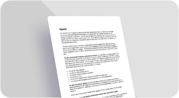 87 Appeals You have the right to appeal an adverse benefit determination (claim denial or rescission of coverage). You or your authorized representative must file your appeal within 180 calendar days after you are notified of the denial or rescission. You will have the opportunity to submit written comments, documents, records, and other information supporting your claim. The Claims Administrator’s review of your claim will take into account all information you submit, regardless of whether it was submitted or considered in the initial benefit determination. The Claims Administrator’s shall offer a single mandatory level of appeal and an additional voluntary second level of appeal which may be a panel review, independent review, or other process consistent with the entity reviewing the appeal. The time frame allowed for the Claims Administrator to complete its review is dependent upon the type of review involved (e.g. pre-service, concurrent, post-service, urgent, etc.). For pre-service claims involving urgent/concurrent care, you may obtain an expedited appeal. You or your authorized representative may request it orally or in writing. All necessary information, including the Claims Administrator’s decision, can be sent between the Claims Administrator and you by telephone, facsimile or other similar method. To file an appeal for a claim involving urgent/concurrent care, you or your authorized representative must contact the Claims Administrator at the number shown on your identification card and provide at least the following information: • the identity of the claimant; • the date (s) of the medical service; • the specific medical condition or symptom; • the provider’s name; • the service or supply for which approval of benefits was sought; and • any reasons why the appeal should be processed on a more expedited basis. All other requests for appeals should be submitted in writing by the Member or the Member’s authorized representative, except where the acceptance of oral appeals is otherwise required by the nature of the appeal (e.g. urgent care). You or your authorized representative must submit a request for review to: Anthem Blue Cross and Blue Shield, ATTN: Appeals, P.O. Box 105568; Atlanta, GA 30348-5568. You must include Your Member Identification Number when submitting an appeal. Upon request, the Claims Administrator will provide, without charge, reasonable access to, and copies of, all documents, records, and other information relevant to your claim. “Relevant” means that the document, record, or other information: • was relied on in making the benefit determination; or • was submitted, considered, or produced in the course of making the benefit determination; or • demonstrates compliance with processes and safeguards to ensure that claim determinations are made in accordance with the terms of the plan, applied consistently for similarly-situated claimants; or • is a statement of the plan’s policy or guidance about the treatment or benefit relative to your diagnosis. The Claims Administrator will also provide you, free of charge, with any new or additional evidence considered, relied upon, or generated in connection with your claim. In addition, before you receive an adverse benefit determination on review based on a new or additional rationale, the Claims Administrator will provide you, free of charge, with the rationale. For Out of State Appeals You have to file Provider appeals with the Host Plan. This means Providers must file appeals with the same plan to which the claim was filed.