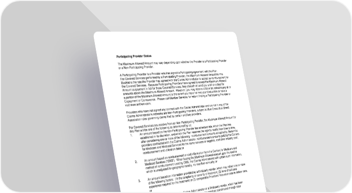 71 Participating Provider Status The Maximum Allowed Amount may vary depending upon whether the Provider is a Participating Provider or a Non-Participating Provider. A Participating Provider is a Provider who has signed a Participating agreement with the Plan. For Covered Services performed by a Participating Provider, the Maximum Allowed Amount for this Booklet is the rate the Provider has agreed with the Claims Administrator to accept as reimbursement for the Covered Services. Because Participating Providers have agreed to accept the Maximum Allowed Amount as payment in full for those Covered Services, they should not send you a bill or collect for amounts above the Maximum Allowed Amount. However, you may receive a bill or be asked to pay all or a portion of the Maximum Allowed Amount to the extent you have not met your Deductible or have a Copayment or Coinsurance. Please call Member Services for help in finding a Participating Provider or visit www.anthem.com. Providers who have not signed any contract with the Claims Administrator and are not in any of the Claims Administrator’s networks are Non-Participating Providers, subject to Blue Cross Blue Shield Association rules governing claims filed by certain ancillary providers. For Covered Services you receive from an Non-Participating Provider, the Maximum Allowed Amount for this Plan will be one of the following as determined by us: 1. An amount based on the non-Participating Provider fee schedule/rate, which the Plan has established in its discretion, and which the Plan reserves the right to modify from time to time, after considering one or more of the following: reimbursement amounts accepted by like/similar providers contracted with the Claims Administrator, reimbursement amounts paid by the Centers for Medicare and Medicaid Services for the same services or supplies, and other industry cost, reimbursement and utilization data; or 2. An amount based on reimbursement or cost information from the Centers for Medicare and Medicaid Services (“CMS”). When basing the Maximum Allowed amount upon the level or method of reimbursement used by CMS, the Claims Administrator will update such information, which is unadjusted for geographic locality, no less than annually; or 3. An amount based on information provided by a third party vendor, which may reflect one or more of the following factors: (1) the complexity or severity of treatment; (2) level of skill and experience required for the treatment; or (3) comparable Providers’ fees and costs to deliver care, or 4. An amount negotiated by the Claims Administrator or a third party vendor, which has been agreed to by the Provider. This may include rates for services coordinated through case management, or 5. An amount based on or derived from the total charges billed by the Non-Participating Provider. Providers who are not contracted for this product, but are contracted for other products with the Claims Administrator are also considered Non-Participating. For this Plan, the Maximum Allowed Amount for services from these Providers will be one of the five methods shown above unless the contract between the Claims Administrator and that Provider specifies a different amount. For Covered Services rendered outside the Claims Administrator’s Service Area by Non-Participating Providers, claims may be priced using the local Blue Cross Blue Shield plan’s Non-Participating provider fee schedule / rate or the pricing arrangements required by applicable state or federal law. In certain situations, the Maximum Allowed Amount for out of area claims may be based on billed charges, the pricing the Plan would use if the healthcare services had been obtained within the Claims Administrator’s Service Area, or a special negotiated price.