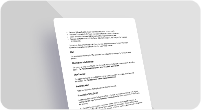 117 • Doctor of Osteopathy (D.O.) legally licensed to perform the duties of a D.O., • Doctor of Chiropractic (D.C.), legally licensed to perform the duties of a chiropractor; • Doctor of Podiatric Medicine (D.P.M.) legally entitled to practice podiatry, and • Doctor of Dental Medicine (D.D.M.), Doctor of Dental Surgery (D.D.S.), legally entitled to provide dental services. Optometrists, Clinical Psychologists (PhD), and surgical chiropodists are also Providers when legally licensed and giving Covered Services within the scope of their licenses. Plan The arrangement chosen by the Plan Sponsor to fund and provide for delivery of the Employer’s health benefits. Plan Claims Administrator The person or entity named by the Plan Sponsor to manage the Plan and answer questions about Plan details. The Plan Claims Administrator is not the Claims Administrator. Plan Sponsor The legal entity that has adopted the Plan and has authority regarding its operation, amendment and termination. The Plan Sponsor is not the Claims Administrator. Precertification Please see the section “Getting Approval for Benefits” for details. Prescription Drug (Drug) A substance, that under the Federal Food, Drug & Cosmetic Act, must bear a message on its original packing label that says, “Caution: Federal law prohibits dispensing without a prescription.” This includes the following: 1) Compounded (combination) medications, when all of the ingredients are FDA-approved, as designated in the FDA’s Orange Book: Approved Drug Products with Therapeutic Equivalence Evaluations, require a prescription to dispense, and are not essentially the same as an FDA-approved product from a drug manufacturer. 2) Insulin, diabetic supplies, and syringes. Prescription Order A written request by a Provider, as permitted by law, for a Prescription Drug or medication, and each authorized refill. Primary Care Physician (“PCP”) A Physician who gives or directs health care services for you. The Physician may work in family practice, general practice, internal medicine, pediatrics, obstetrics/gynecology, geriatrics or any other practice allowed by the Plan. Primary Care Provider