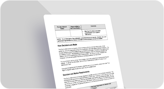 33 Provider Network Status Responsibility to Get Precertification Comments • Blue Card Providers must obtain precertification for all Inpatient Admissions. NOTE: For an Emergency Care admission, precertification is not required. However, you, your authorized representative or Doctor must tell us of the admission as soon as possible. How Decisions are Made The Claims Administrator will use its clinical coverage guidelines, such as medical policy, clinical guidelines, and other applicable policies and procedures to help make Medical Necessity decisions. This includes decisions about Prescription Drugs as detailed in the section “Prescription Drugs Administered by a Medical Provider”. Medical policies and clinical guidelines reflect the standards of practice and medical interventions identified as proper medical practice. We reserve the right, on behalf of the Employer, to review and update these clinical coverage guidelines from time to time. You are entitled to ask for and get, free of charge, reasonable access to any records concerning your request. To ask for this information, call the Precertification phone number on the back of your Identification Card. If you are not satisfied with the decision under this section of your benefits, please refer to the “Your Right To Appeal” section to see what rights may be available to you. Decision and Notice Requirements The Claims Administrator will review requests for benefits according to the timeframes listed below. The timeframes and requirements listed are based on federal laws. If you live in and/or get services in a state other than the state where your Plan was issued other state-specific requirements may apply. You may call the phone number on the back of your Identification Card for more details. The Claims Administrator will accept a request for Pre-service Reviews sent to the Plan by your provider through secure electronic submission. Type of Review Timeframe Requirement for Decision and Notification Urgent Pre-service Review 72 hours or 2 business days from the receipt of request whichever is less Non-Urgent Pre-service Review 2 business days from the receipt of request Urgent Continued/Concurrent Stay Review when request is received more than 24 hours before the end of the previous authorization 24 hours from the receipt of the request Urgent Continued/Concurrent Stay Review when request is received less than 24 hours before the end of the previous authorization or no previous authorization exists 72 hours from the receipt of the request or 2 business days from the receipt of request whichever is less