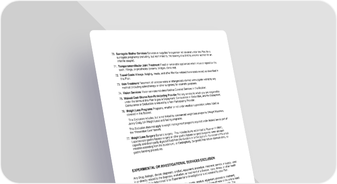 68 70. Surrogate Mother Services Services or supplies for a person not covered under this Plan for a surrogate pregnancy (including, but not limited to, the bearing of a child by another woman for an infertile couple). 71. Temporomandibular Joint Treatment Fixed or removable appliances which move or reposition the teeth, fillings, or prosthetics (crowns, bridges, dentures). 72. Travel Costs Mileage, lodging, meals, and other Member-related travel costs except as described in this Plan. 73. Vein Treatment Treatment of varicose veins or telangiectatic dermal veins (spider veins) by any method (including sclerotherapy or other surgeries) for cosmetic purposes. 74. Vision Services Vision services not described as Covered Services in this Booklet. 75. Waived Cost-Shares Non-Participating Provider For any service for which you are responsible under the terms of this Plan to pay a Copayment, Coinsurance or Deductible, and the Copayment, Coinsurance or Deductible is waived by a Non-Participating Provider. 76. Weight Loss Programs Programs, whether or not under medical supervision, unless listed as covered in this Booklet. This Exclusion includes, but is not limited to, commercial weight loss programs (Weight Watchers, Jenny Craig, LA Weight Loss) and fasting programs. This Exclusion does not apply to weight management programs required under federal law as part of the “Preventive Care” benefit. 77. Weight Loss Surgery Bariatric surgery. This includes but is not limited to Roux-en-Y (RNY), Laparoscopic gastric bypass surgery or other gastric bypass surgery (surgeries lower stomach capacity and divert partly digested food from the duodenum to the jejunum, the section of the small intestine extending from the duodenum), or Gastroplasty, (surgeries that reduce stomach size), or gastric banding procedures. EXPERIMENTAL OR INVESTIGATIONAL SERVICES EXCLUSION Any Drug, biologic, device, diagnostic, product, equipment, procedure, treatment, service, or supply, used in or directly related to the diagnosis, evaluation, or treatment of a disease, injury, illness, or other health problem which is determined to be Experimental or Investigational is not covered by your Plan. The Plan will deem any Drug, biologic, device, Diagnostic, product, equipment, procedure, treatment, service, or supply to be Experimental or Investigational if determined that one of more of the criteria listed below apply when the service is rendered with respect to the use for which benefits are sought. The Drug, biologic, device, Diagnostic, product, equipment, procedure, treatment, service, or supply: • cannot be legally marketed in the United States without the final approval of the Food and Drug Administration (FDA), or other licensing or regulatory agency, and such final approval has not been granted; • has been determined by the FDA to be contraindicated for the specific use; or • is subject to review and approval of an Institutional Review Board (IRB) or other body serving a similar function; or • is given because of informed consent documents that describe the Drug, biologic, device, Diagnostic, product, equipment, procedure, treatment, service, or supply as Experimental or Investigational, or otherwise show that the safety, toxicity, or efficacy of the Drug, biologic, device, Diagnostic, product, equipment, procedure, treatment, service, or supply is under evaluation.